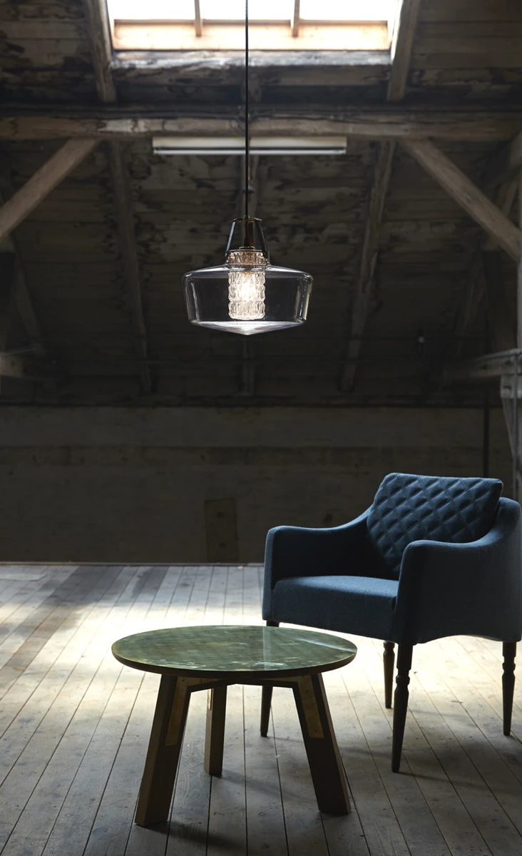 Addicted to us er en estetisk og rå lampe. Lampen har ytterskjerm i håndblåst røykfarget glass og en indre kjerne i klart, fasettslipt glass. Lampens oppheng er i sort med tre sorte remmer i lær.