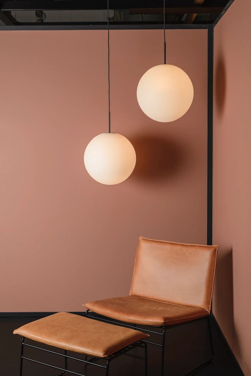 Lampen kommer i fem farger: Hvit, Grå, Kakao, Oliven og Blå.