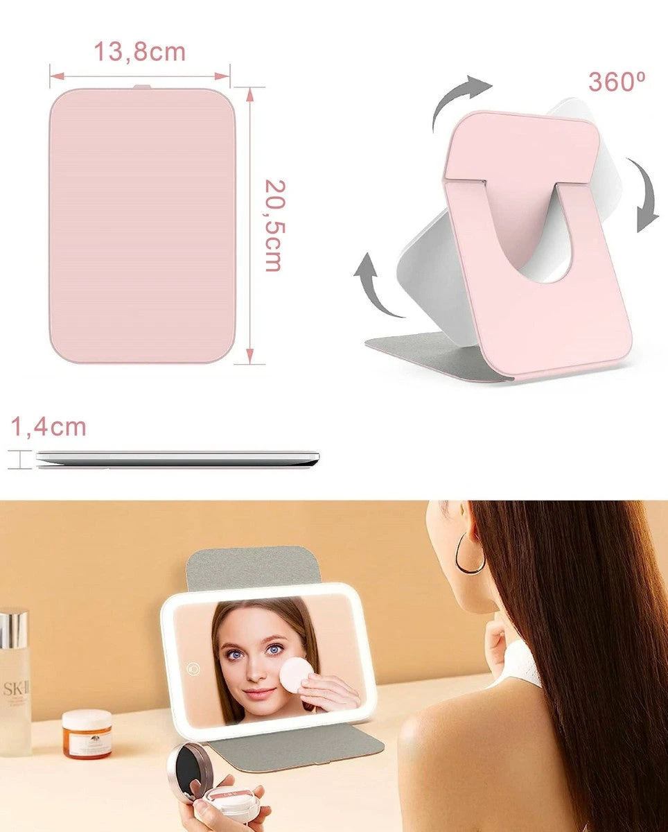 Stilrent og stort sminkespeil med oppladbart lys. Touch-bryter for av/på, valg av fargetemperatur på lyset og trinnløs dimming. Lyset slukker automatisk når sminkespeilet lukkes. Speilet er roterbart på omslaget og kan settes i ulike posisjoner. Inkl. USB C ledning.