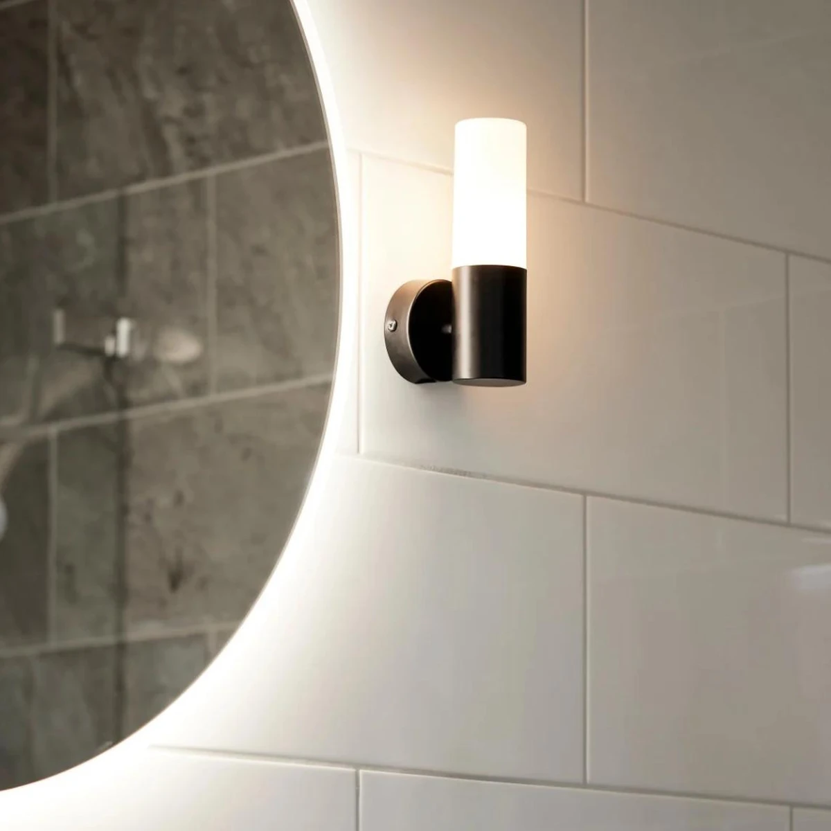 Vegglampe i minimalistisk design med opalglass og metallramme i matt sort. Lampen er beskyttet mot fukt i IP44-klassifisering og passer godt i baderomsmiljøer. Vær oppmerksom på at denne armaturen er for fast installasjon og ikke leveres med separat kontakt og tilkoblingskabel.