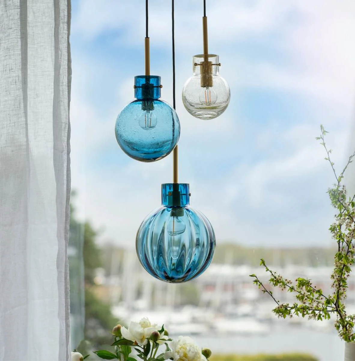 I denne kombinasjonen er det brukt følgende krystallkuler: Optikk stålblå 200 mm, Soda stålblå 160 mm og Soda klar 120 mm. Messingoppheng til 3 krystallkuler med sort tekstiltrukket kabel på 3 meter. Rund takbaldakin 34cm.