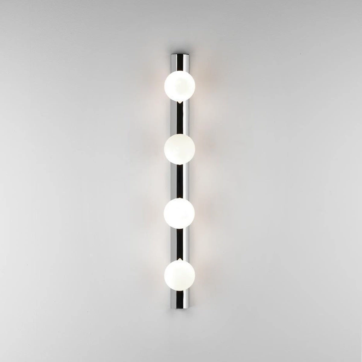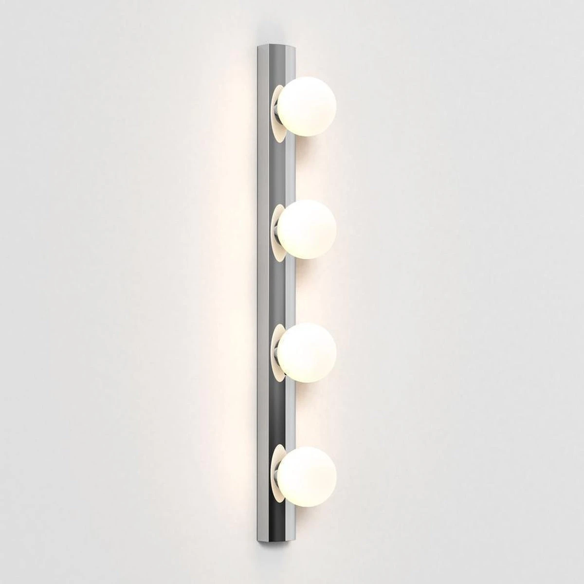 Denne vegglampen er et moderne uttrykk for det klassiske Hollywood -speilet, og har en slank stålkropp og fire blåste glasskuler for jevn belysning.