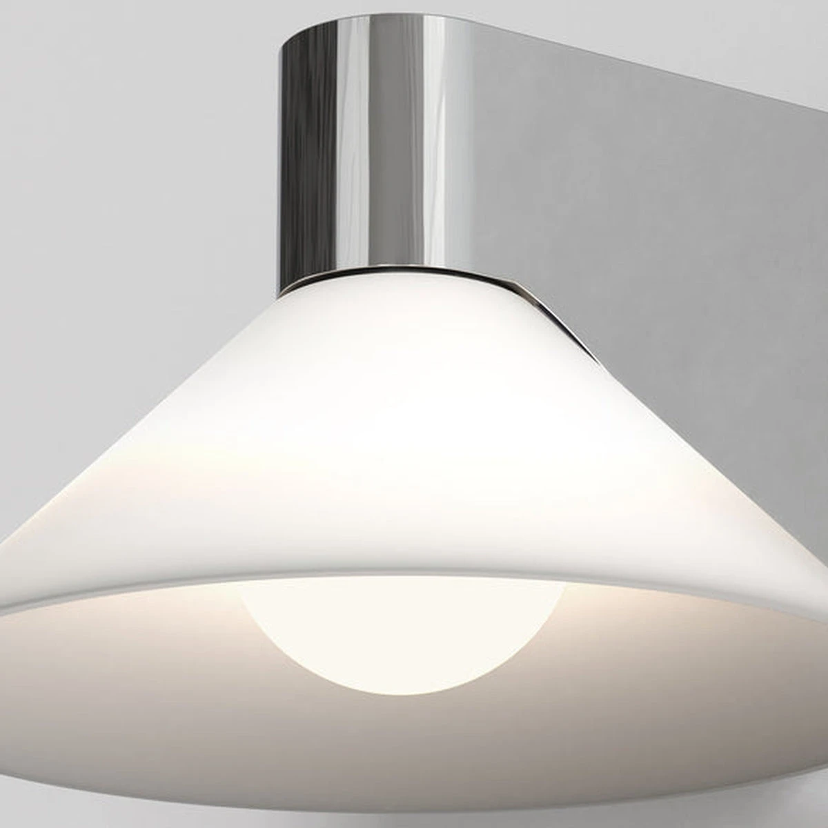 Denne strømlinjeformede vegglampen på badet har en skarp, presstøpt metallbase og en konisk blåst glassskjerm, og gir en følelse av symmetri når den installeres som et par på hver side av et speil. Tilgjengelig i matt sort eller polert krom, gir den funksjonell, men likevel atmosfærisk nedadgående belysning. IP44-klassifisert for sikker bruk på baderommet