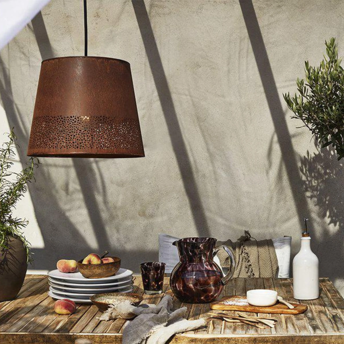 Corta takskjerm i metall. Skjermen har et utskjært hullmønster på nedre del, som gir en fin glød når lampen er på og lyset strømmer ut gjennom mønsteret.