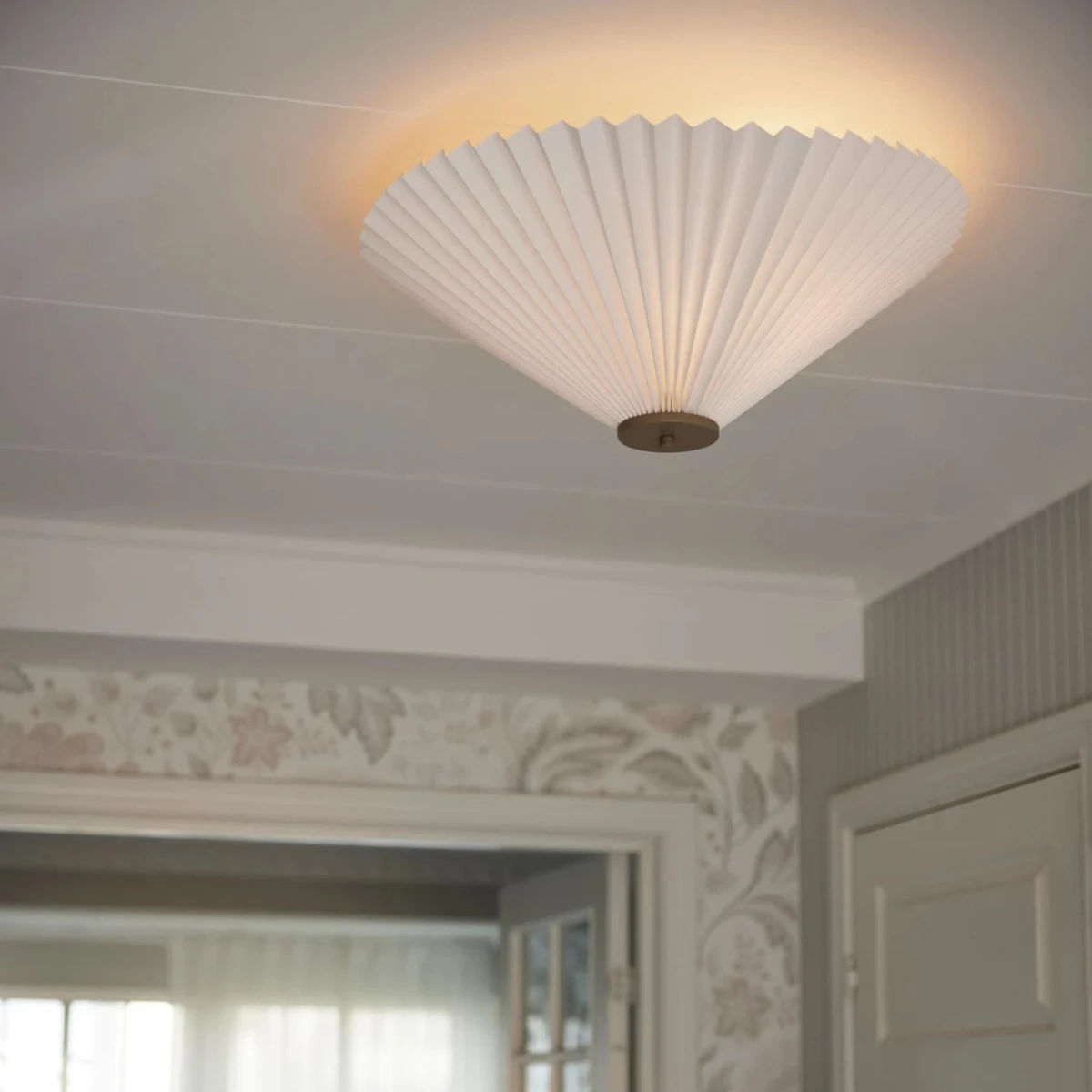Plafond med lampeskjerm i hvitt papir. Lampen leveres med 3 stk E14 lampeholdere, klargjort for jordet tilkobling og krokoppheng til eksisterende takkontakt. Den øverste delen i beigefarget metall. Når lyset er på, spres det et fint lys i rommet. Perfekt å plassere i gangen, soverommet, stuen eller på kjøkkenet.