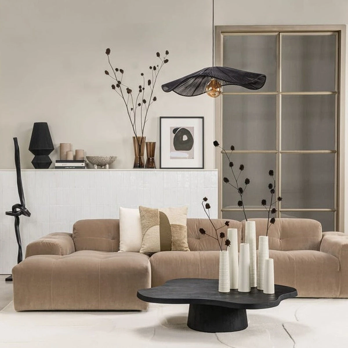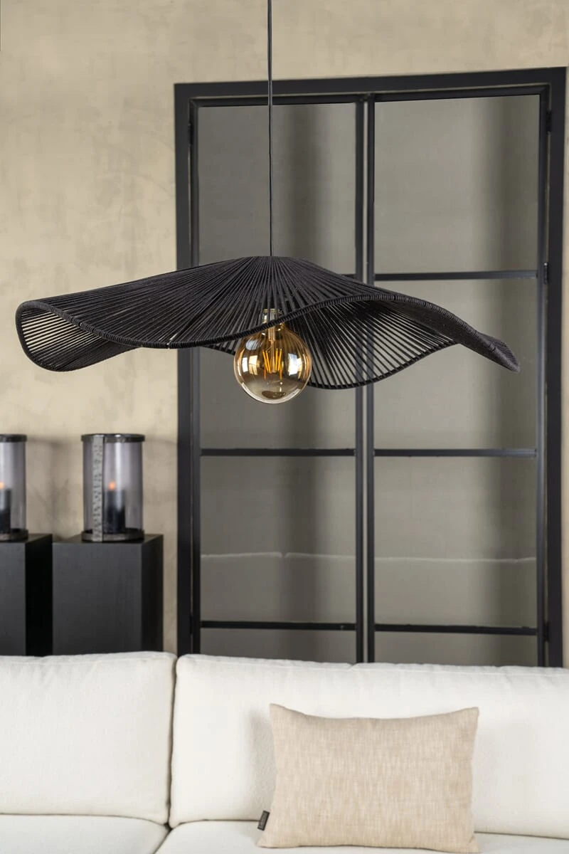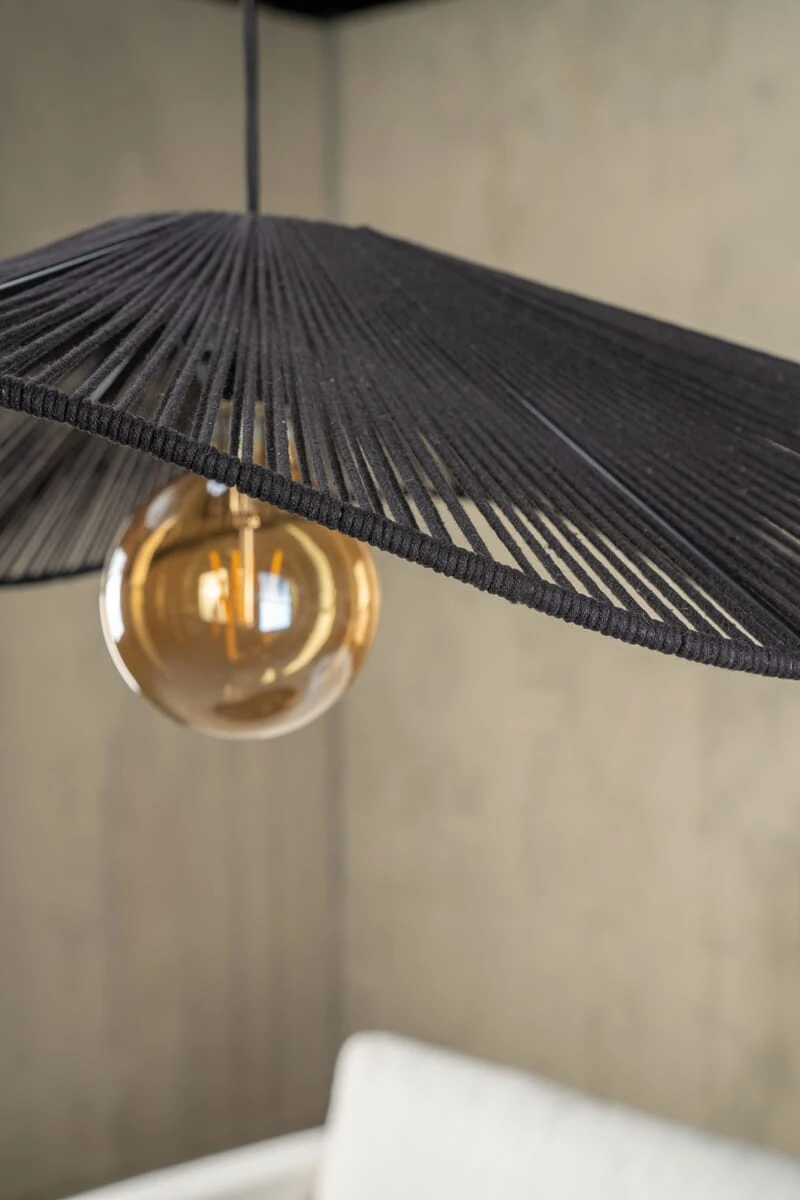 Taklampe på 78 cm med base i jern trukket med bomull. Nydelig flytende fasong.