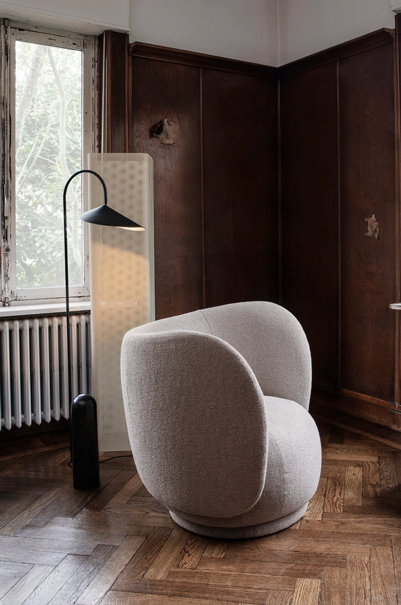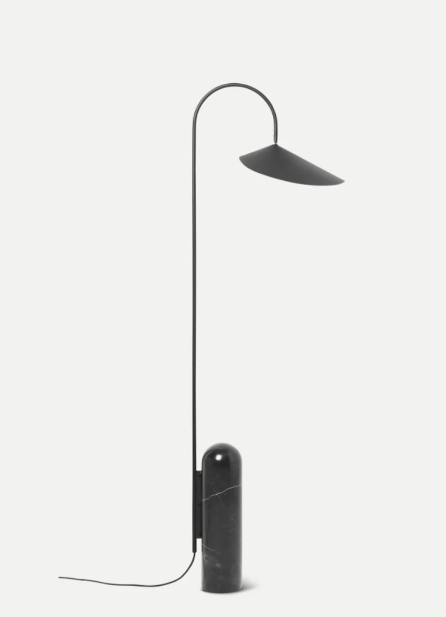 Arum Gulvlampe fra Ferm living er en vakker lampe med et karakteristisk design som vil dekorere rommet ditt. Skjermen minner om ett blad og den er bevegelig så du kan styre lyset. Lampen er laget i sort metall, undersiden av skjermen er hvit så du får mest mulig utbytte av lyset. Lampefoten på lampen er av sort marmor.