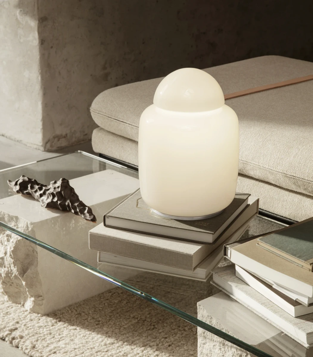 Bell bordlampe er inspirert av vintage glasslamper fra 70-tallet. Denne bordlampen belyser hjemmet ditt med et mykt og diffust lys. Lampen er utelukkende laget av opalglass med en slank, blank finish, og består av to enkle, geometriske former balansert på en krombase. Bruk den som en dekorativ lampe i et mørkt hjørne eller på en hylle for å lyse opp favorittbøkene dine.