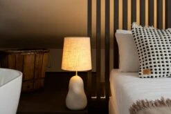Hebe Bordlampe Medium i Offwhite/Natur er en dekorativ bordlampe fra det danske merket Ferm Living. Lampefoten er formet for hånd i keramikk, som er kombinert med den klassiske lampeskjermen i tekstil. Lampens organiske form gir hjemmet et kunstnerisk preg. Lampeskjermen har lokk så du ikke blir blendet av lyspæren.