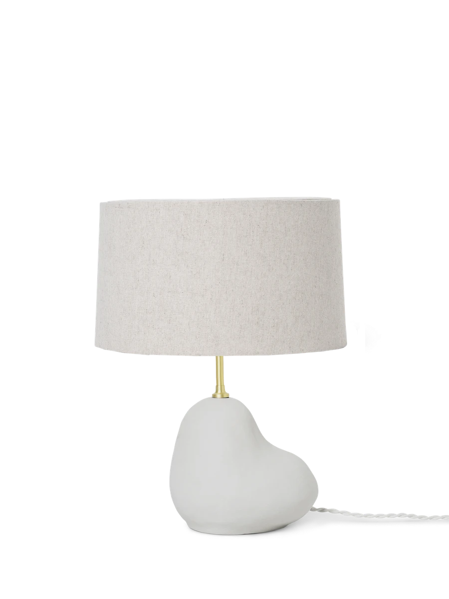 Hebe Bordlampe Small OffWhite/Natur er en dekorativ bordlampe fra det danske merket Ferm Living. Lampefoten er formet for hånd i keramikk, som er kombinert med den klassiske lampeskjermen i tekstil. Lampens organiske form gir hjemmet et kunstnerisk preg. Lampeskjermen har lokk så du ikke blir blendet av lyspæren.