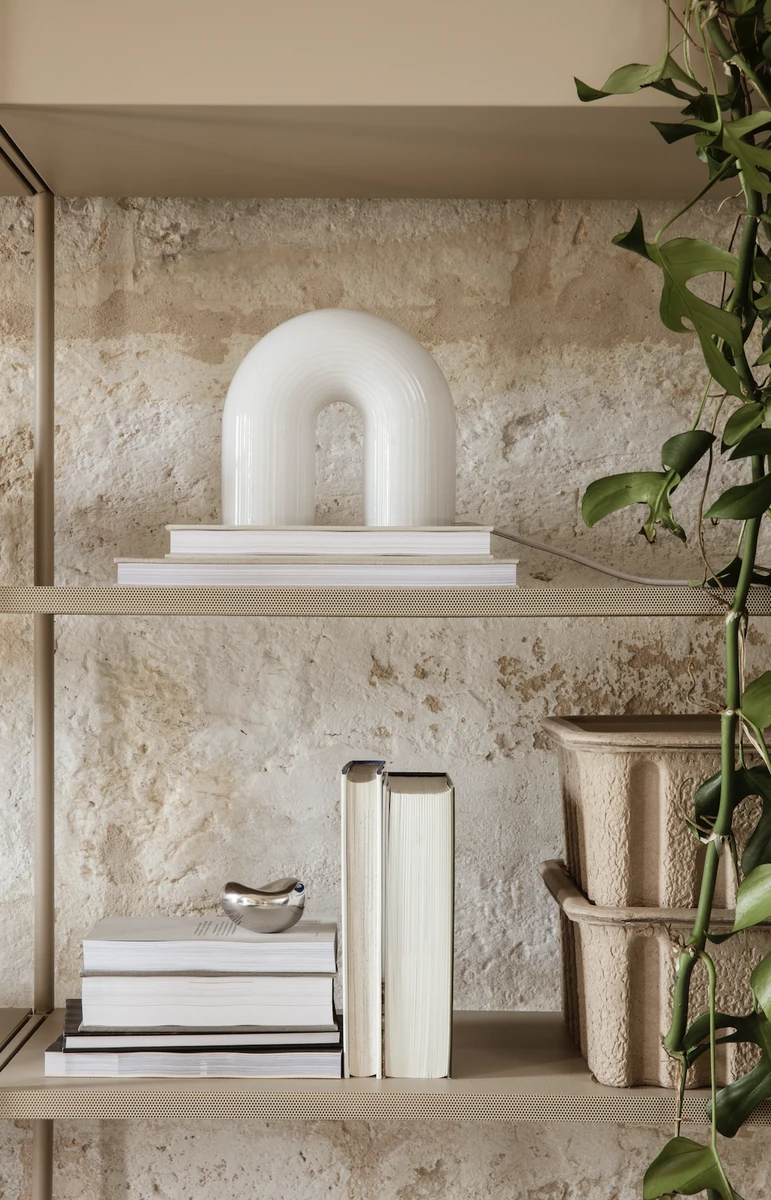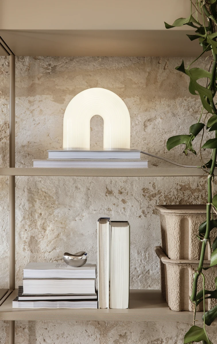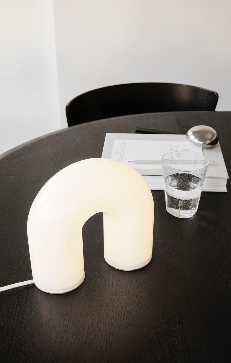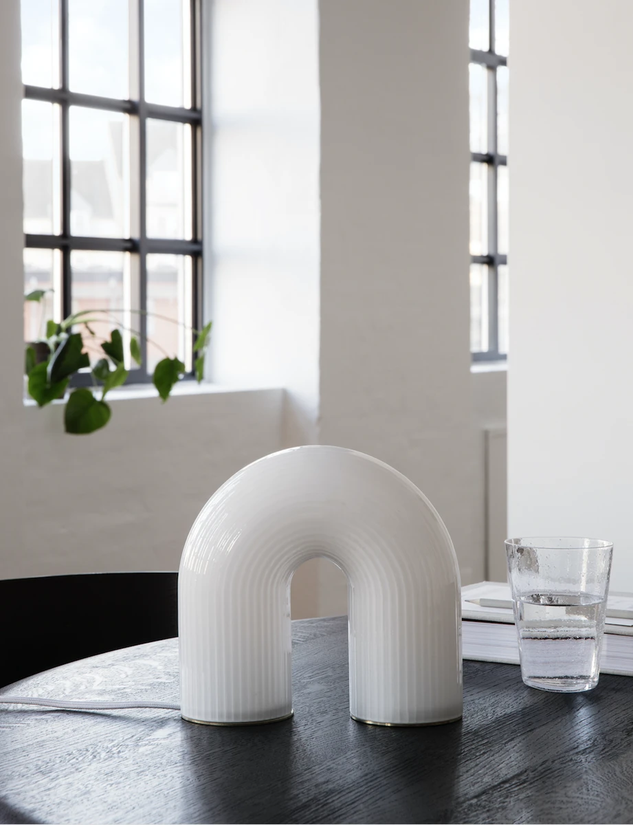 Vuelta er en dekorativ lampe fra Ferm Living. Lampen er en skulpturell bue som minner om gamle søyler. Vuelta lampen er laget av opalhvitt glass med en riflet overflate. Den har LED-lyskilde og gir ett mykt og diffust lys, det er også dimmer på lampen så du kan justere lysstyrken.