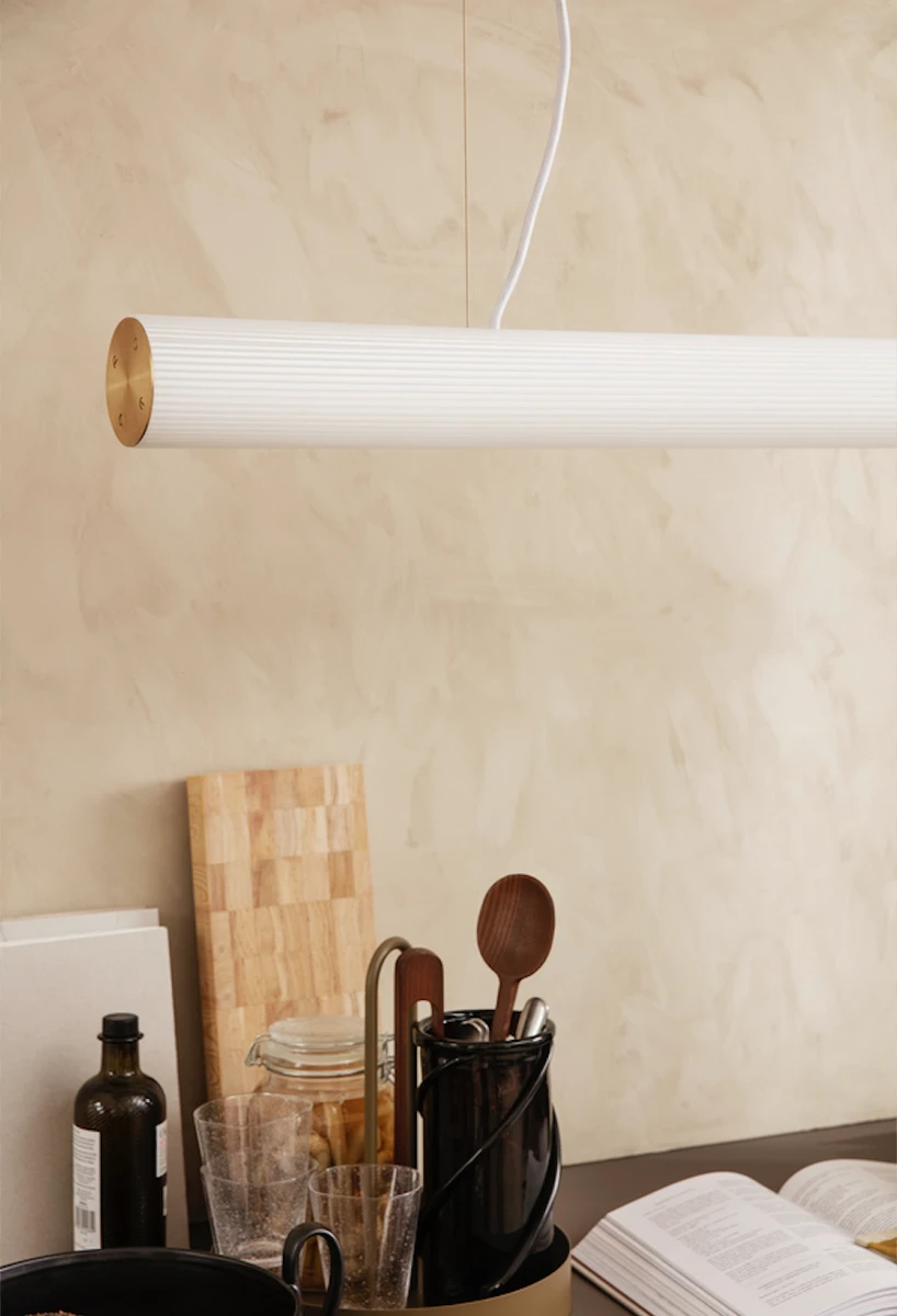 Vuelta taklampe fra Ferm Living smelter sammen kompleksitet med moderne enkelhet og har sylindrisk opalt glass med en tydelig rillet overflate og detaljer i messing. Lampen har en LED-lyskilde som avgir et mykt, diffust lys. Det medfølger en fjernkontroll som dimmer lyset for optimal atmosfære i rommet. Lampen er flott alene eller heng flere lamper på rad.