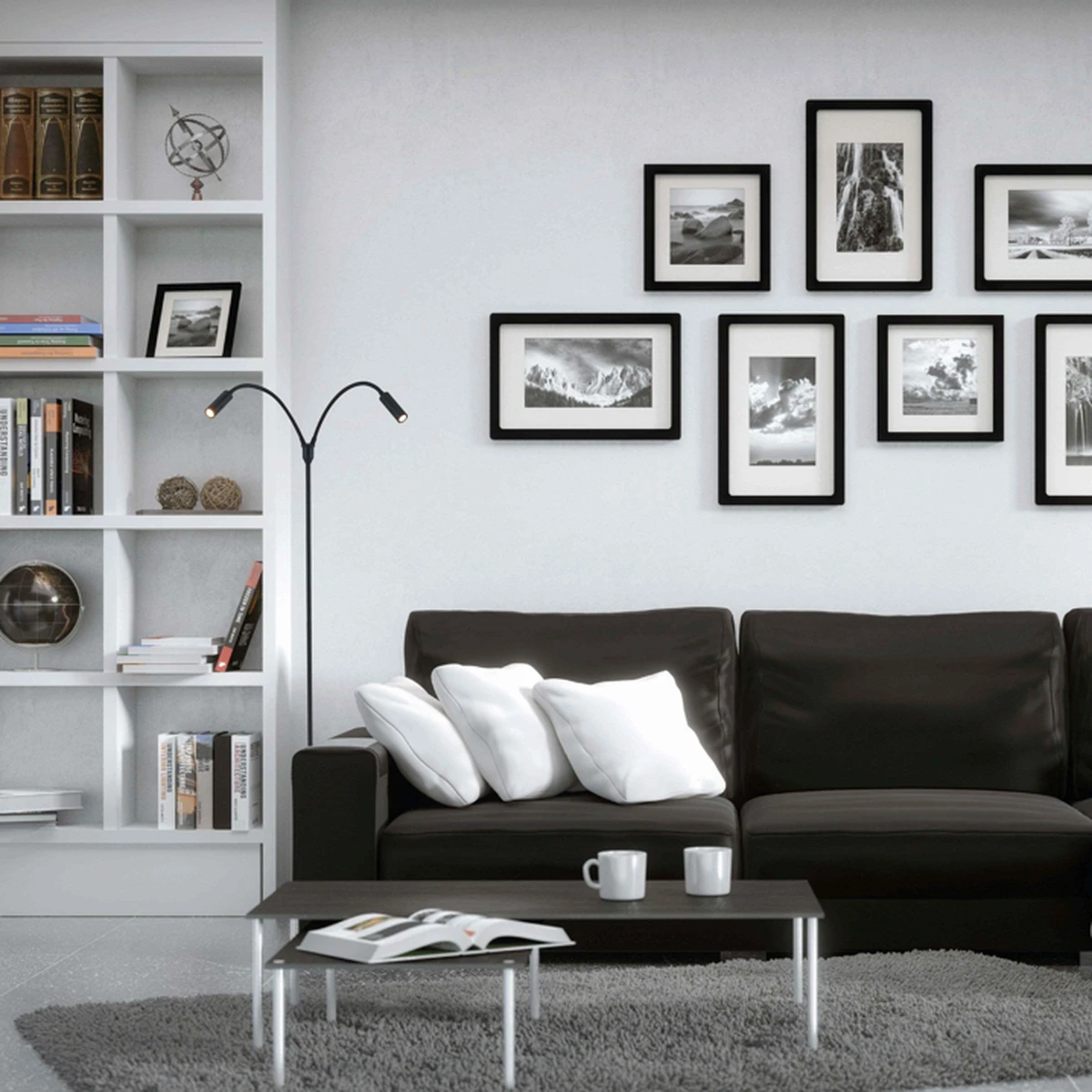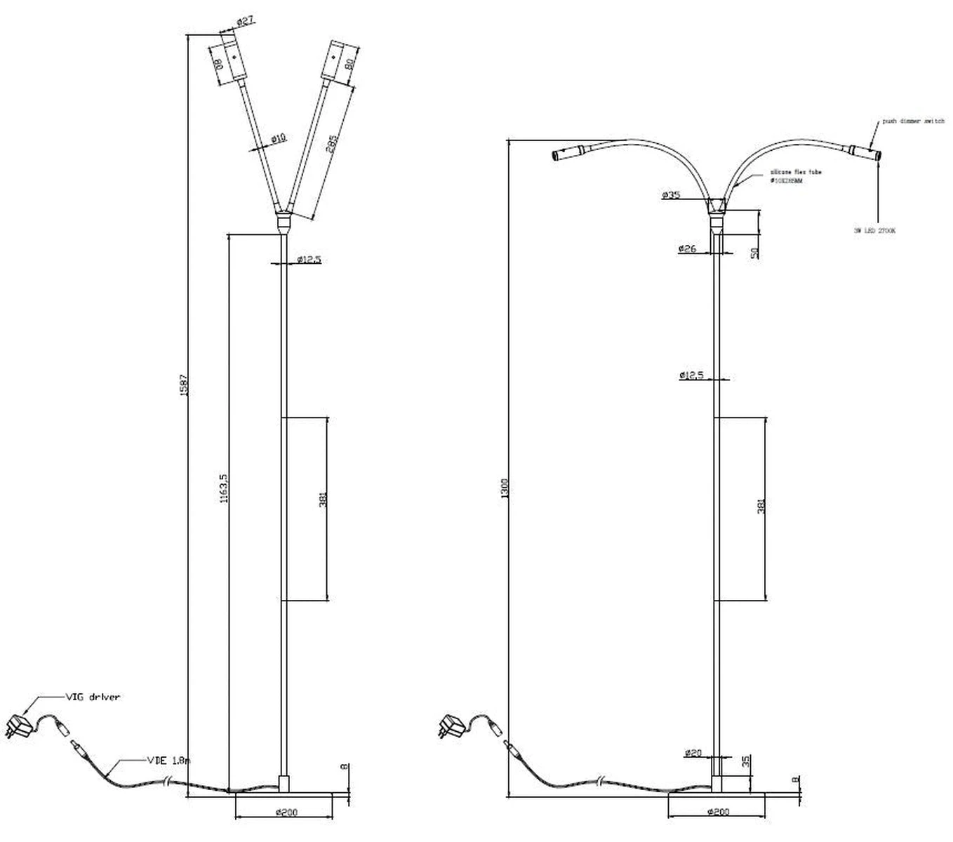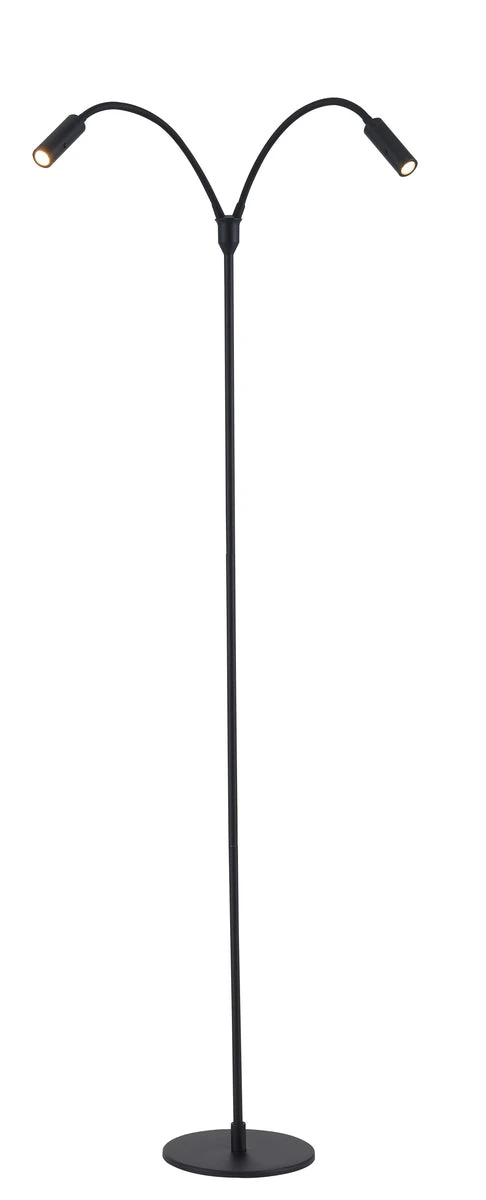 Gulvlampe med to lys. Begge lysene har individuelle push-dimmere på lampehodet. Armene er fleksible og kan bøtes i alle retninger.