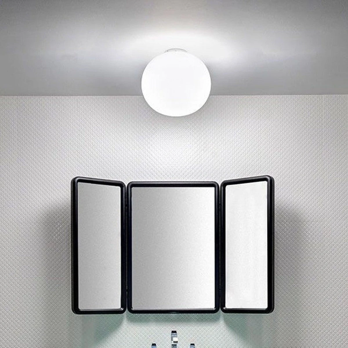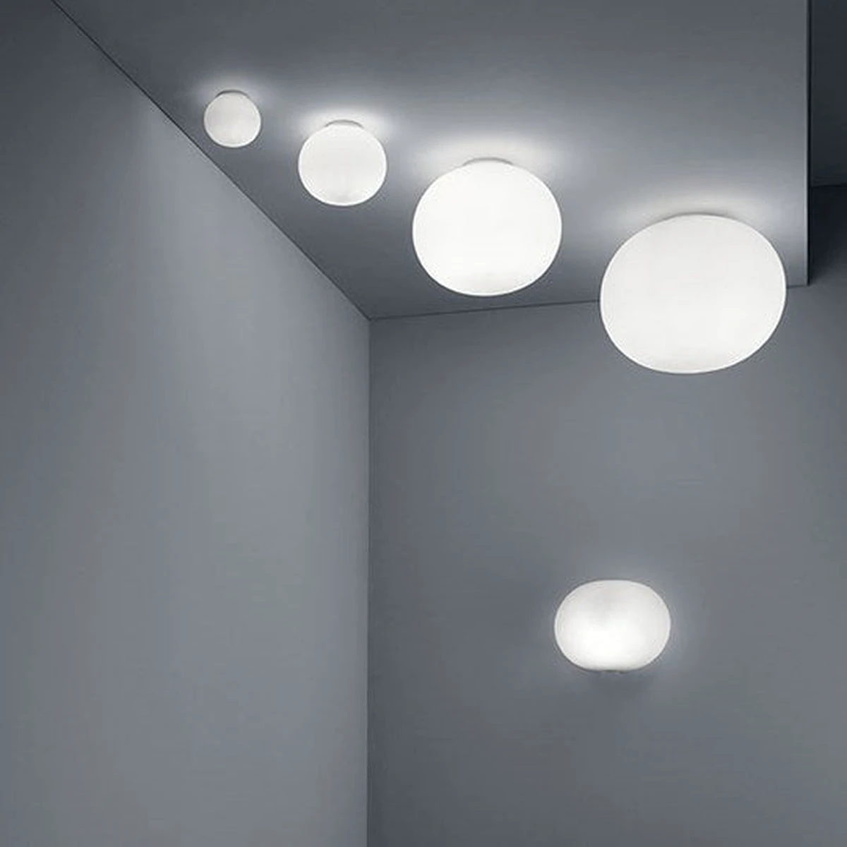 Glo-Ball C/W Zero vegg/tak er en enkel men genial lampe. Den enkle formen kombinert med godt lys gjør denne lampen til en meget anvendelig lampe som passer i alle rom. Det opale glasset gir et jevnt og behagelig lys som ikke blender. Passer godt i gangen, trappeoppgangen eller på badet og kan brukes på vegg eller i taket. Den er laget av ett stykke hvitt, munnblåst glass og minner mest om en måne med jevn, generell belysning. Glo-Ball er en del av en stor serie bordlamper, gulvlamper, vegg- og taklamper. Designet av Jasper Morrison i 2009