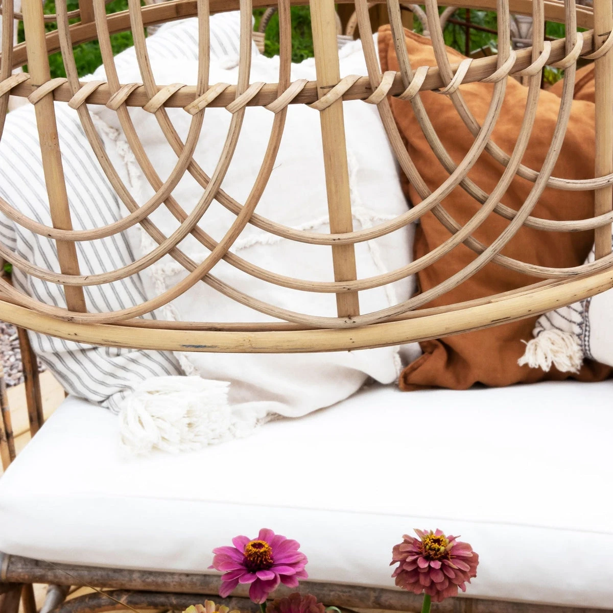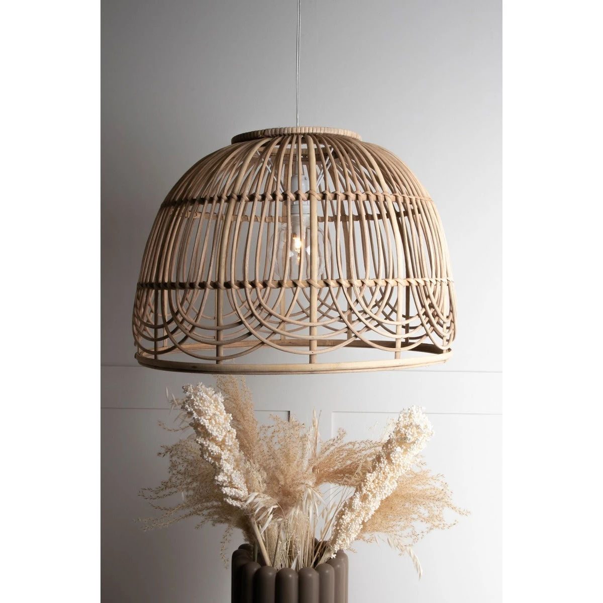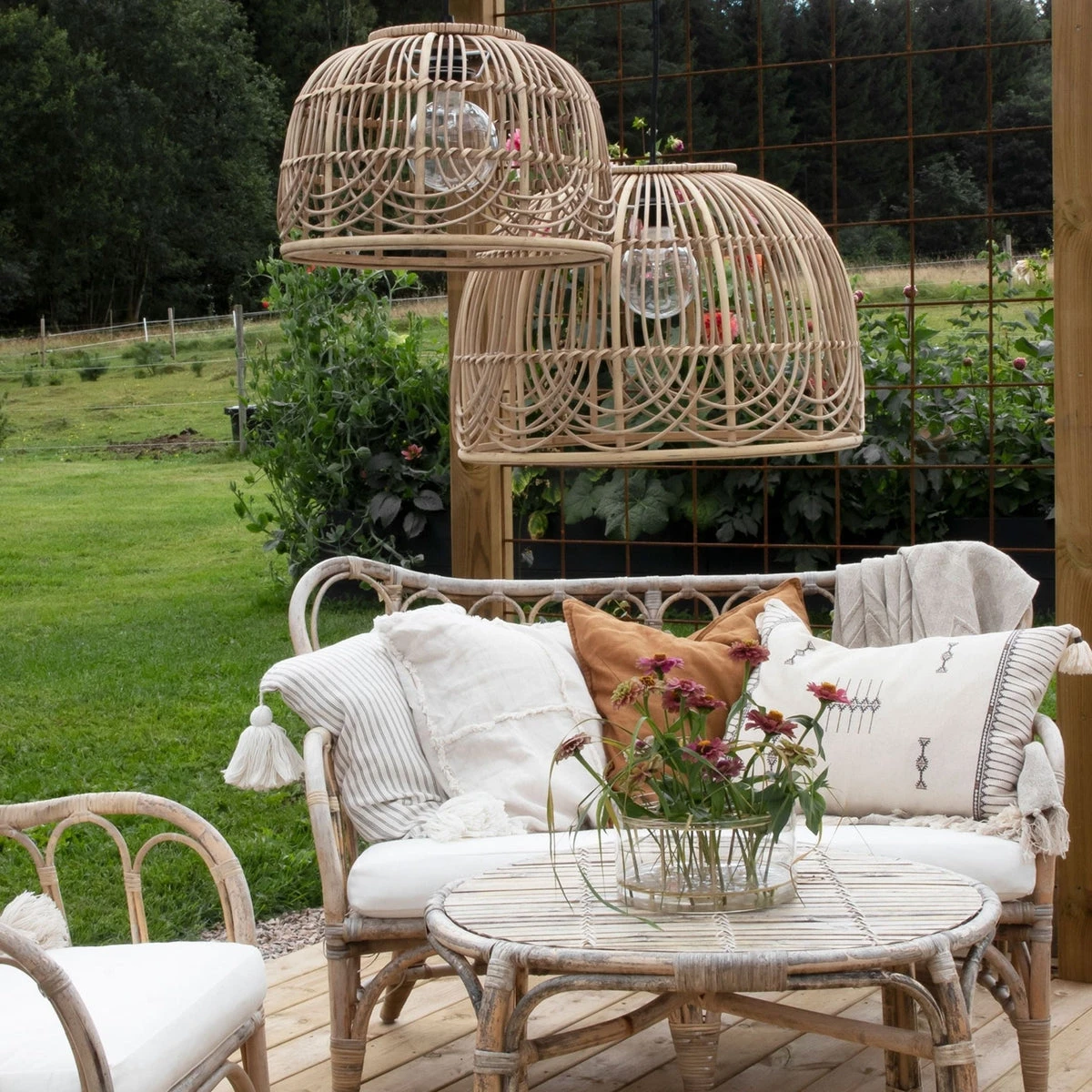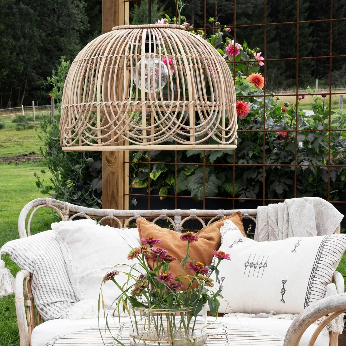 Der, på en liten restaurant, blant bambusmøbler og en parasoll, henger denne dekorative lampen med sine bølgende buer.