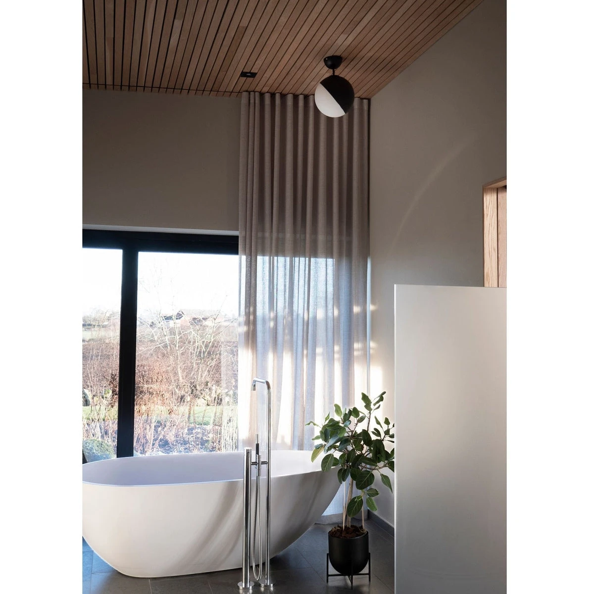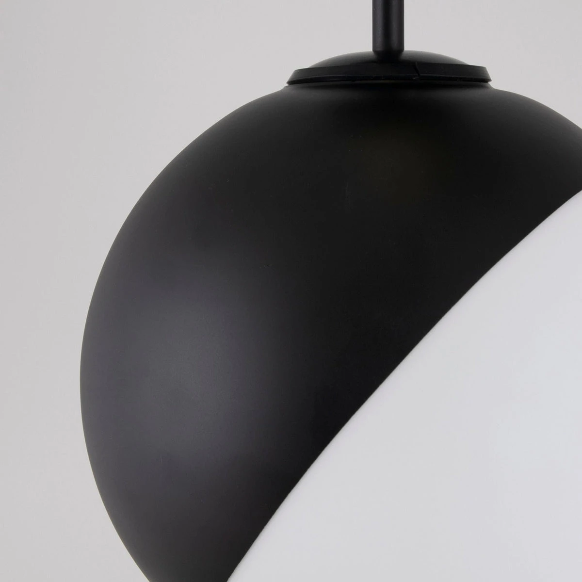 Lampen er laget av matt hvitt glass hvor halve glasset er innglasset i matt sort.