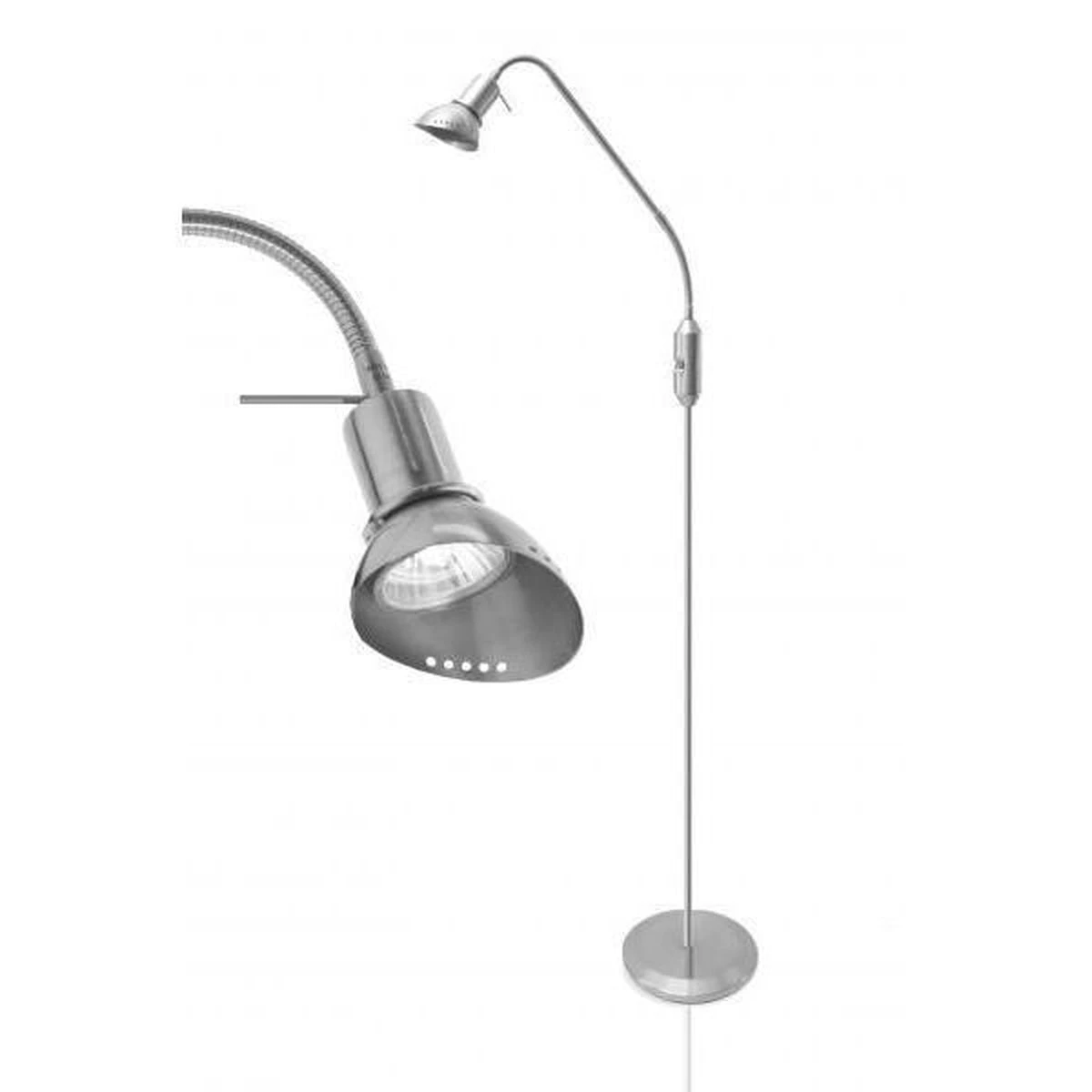 Ingo leselampe i børstet stål med dekorative hull på koppen. Detaljer i krom og to fleksiarmer.