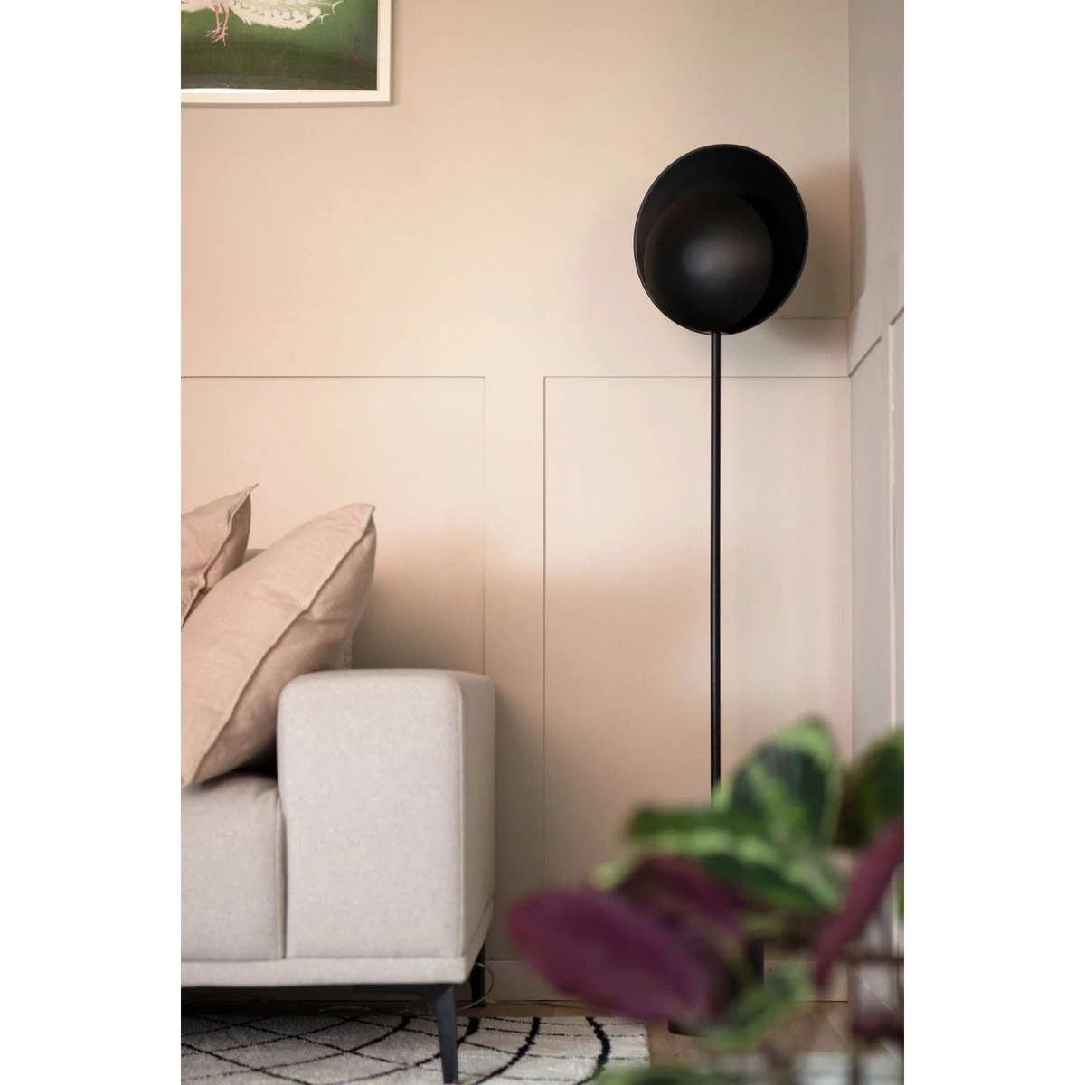 Lampen er montert på en sort sylindrisk metallfot, som gir den et elegant utseende, plasser den ved siden av sofaen eller i et hjørne hvor du trenger stemningsbelysning.
