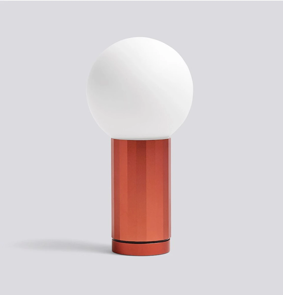 HAY TURN ON er en vakker liten lampe designet av aluminium og opalt glass. Basen er en fasettert sylinder som fungerer som både lysbryteren og stammen som holder den runde glasskuppelen på plass. Ved å vri basen med urviseren klikker du på LED-lyset, og ytterligere rotasjon øker lysstyrken.