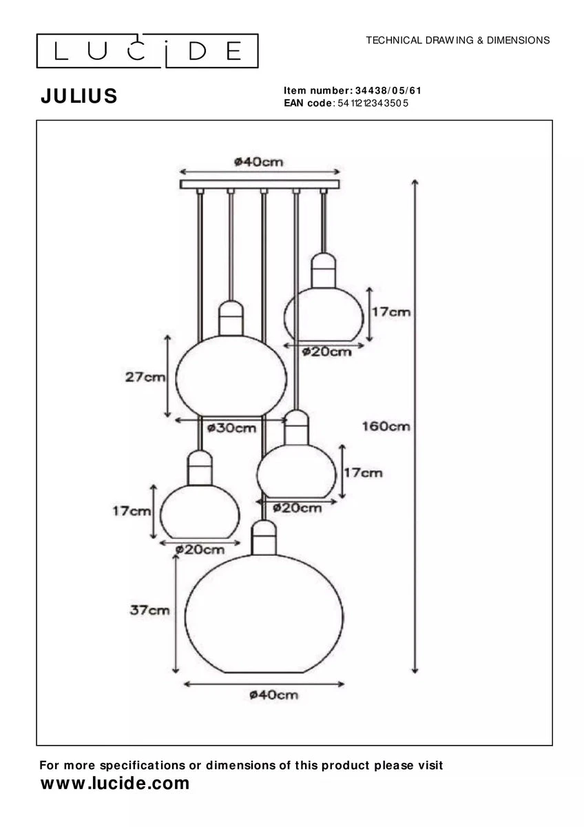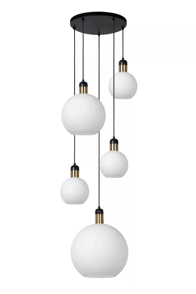 Julius er en nydelig taklampe som gir et flott blikkfang. Lampen leveres med 5 glasskuler i opal glass. Modellen finnes også som enkel pendel, skinne og gulvlampe.