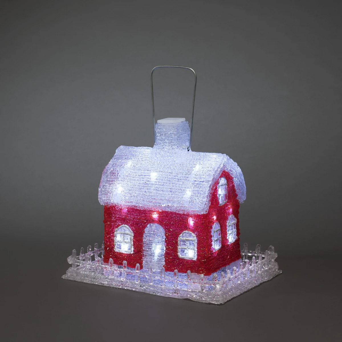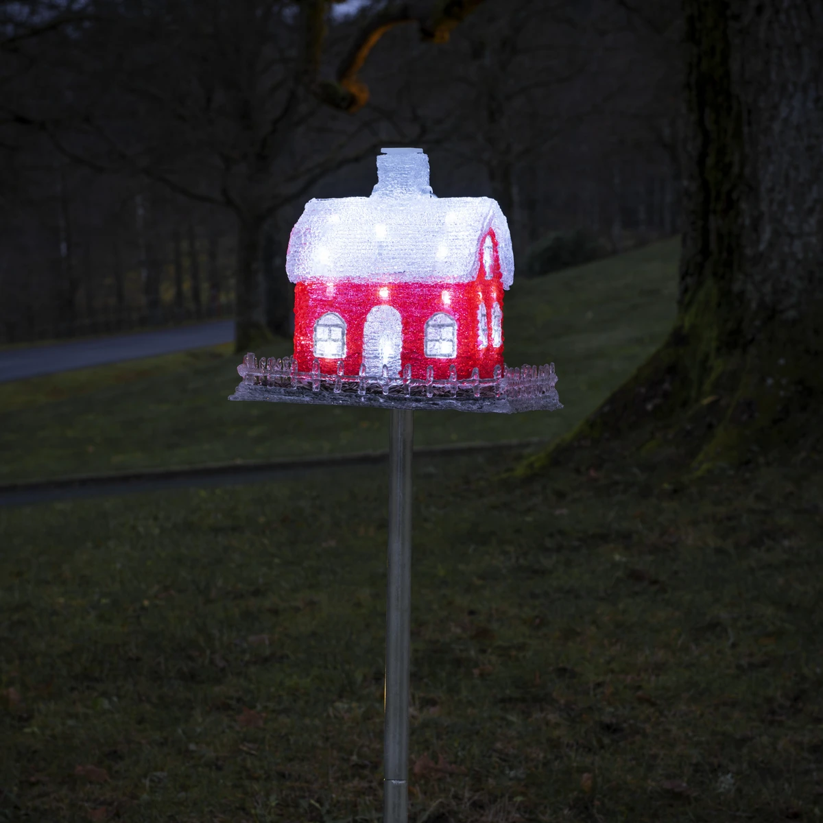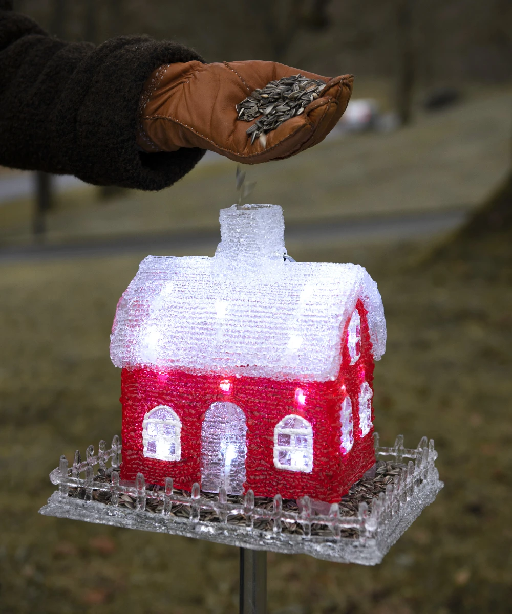 By fuglene på et herlig og uforglemmelig måltid og en svært koselig atmosfære i det røde huset med LED-lys. Fuglehuset leveres både med hank for oppheng og markspyd for feste i bakken, slik at du kan velge det som passer best hos deg.