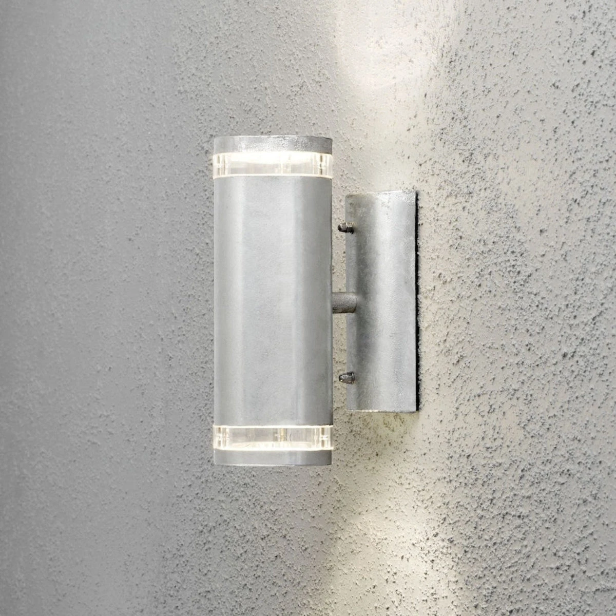 Moderne og dekorativ utelampe som lyser kraftig både opp og ned på veggen. Lampen er en del av en lampe-serie som finnes i flere varianter.