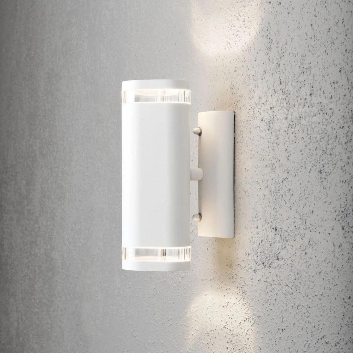 Moderne og dekorativ utelampe som lyser kraftig både opp og ned på veggen. Lampen er en del av en lampe-serie som finnes i flere varianter.