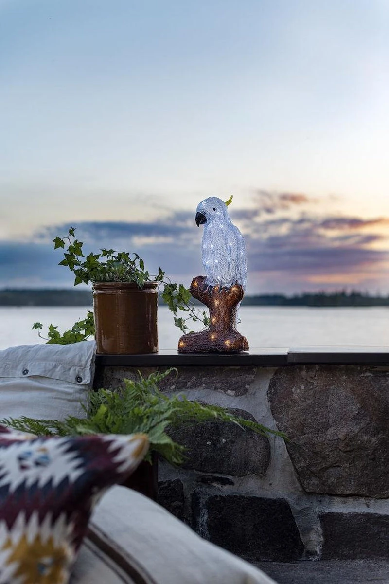 Papegøye med 48 hvite LED-lys, egnet til utendørsbruk. Transformator medfølger.