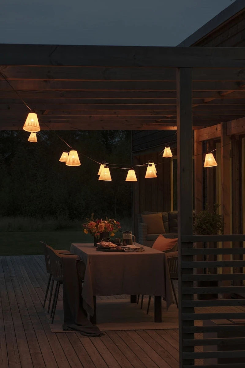 Nydelig lysslynge med amberfarget/varmt lys, som er med på å skape ekstra koselig stemning. Lyspærene henger ned fra hovedledningen og har krok på hvert lyspunkt. Lysslyngen leveres med gule skjermer og transformator som har innebygget dimmer, slik at du kan justere lysstyrken etter behov.