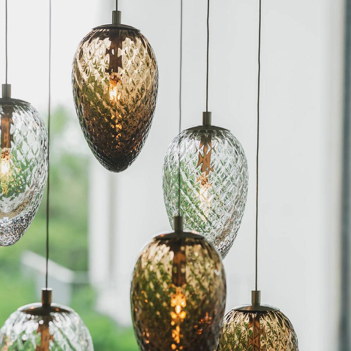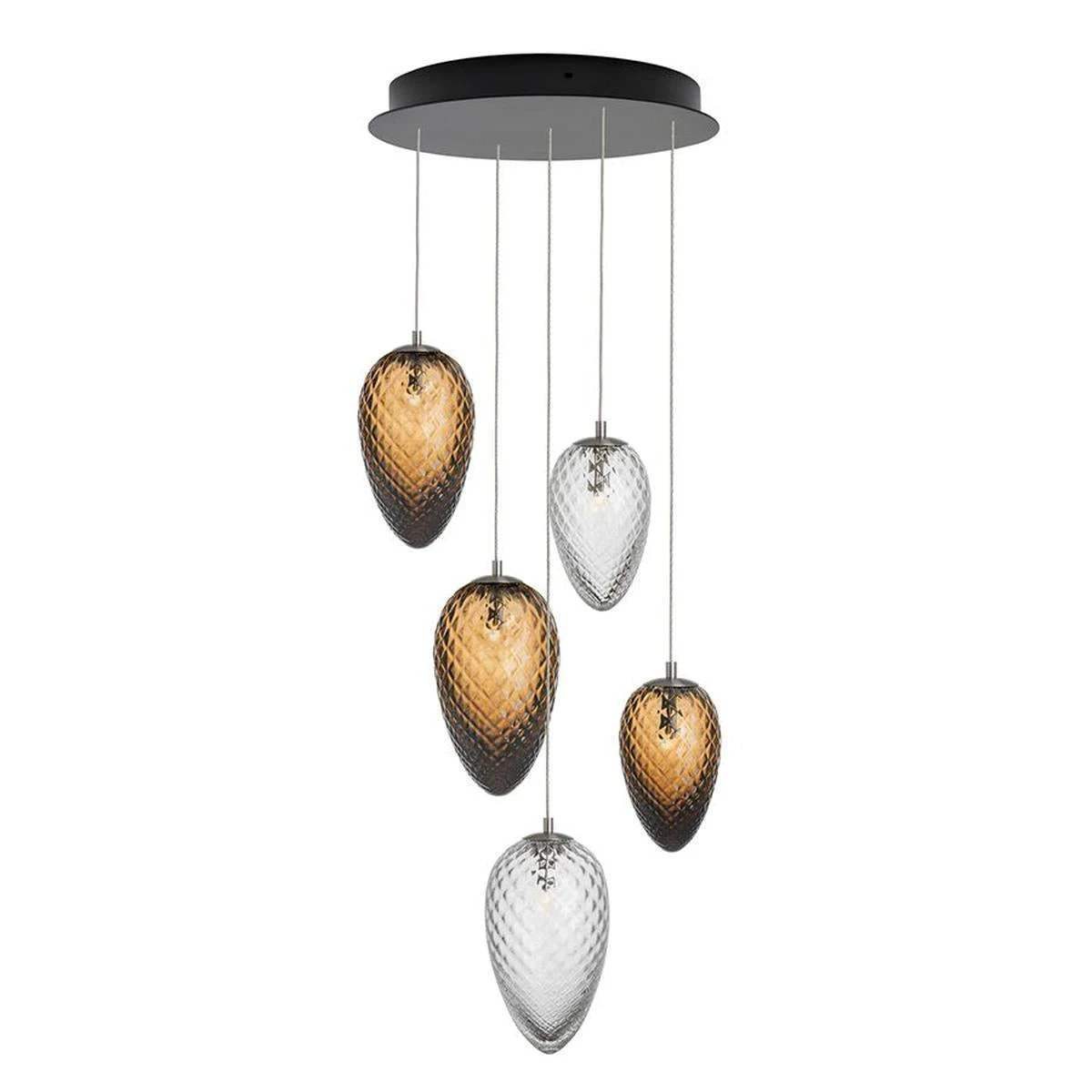 Inneholder 5 munnblåste kongler i flott harmoni, i størrelsene 17cm, 21cm og 23cm i kakao og 17cm og 23cm klart glass.