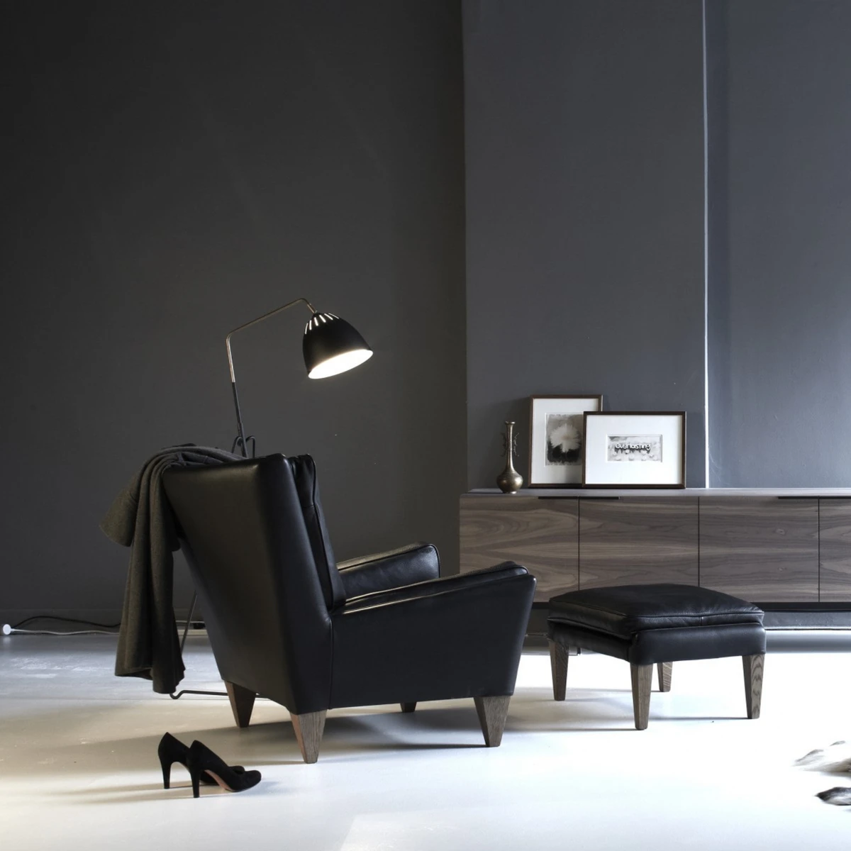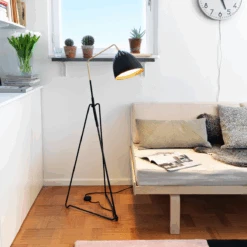 Lean er tilgjengelig i matt svart og hvit teksturfarge. Gulvlampens skrå arm strekker seg praktisk over en sofa eller lenestol, og den justerbare skjermen gir et komfortabelt leselys.