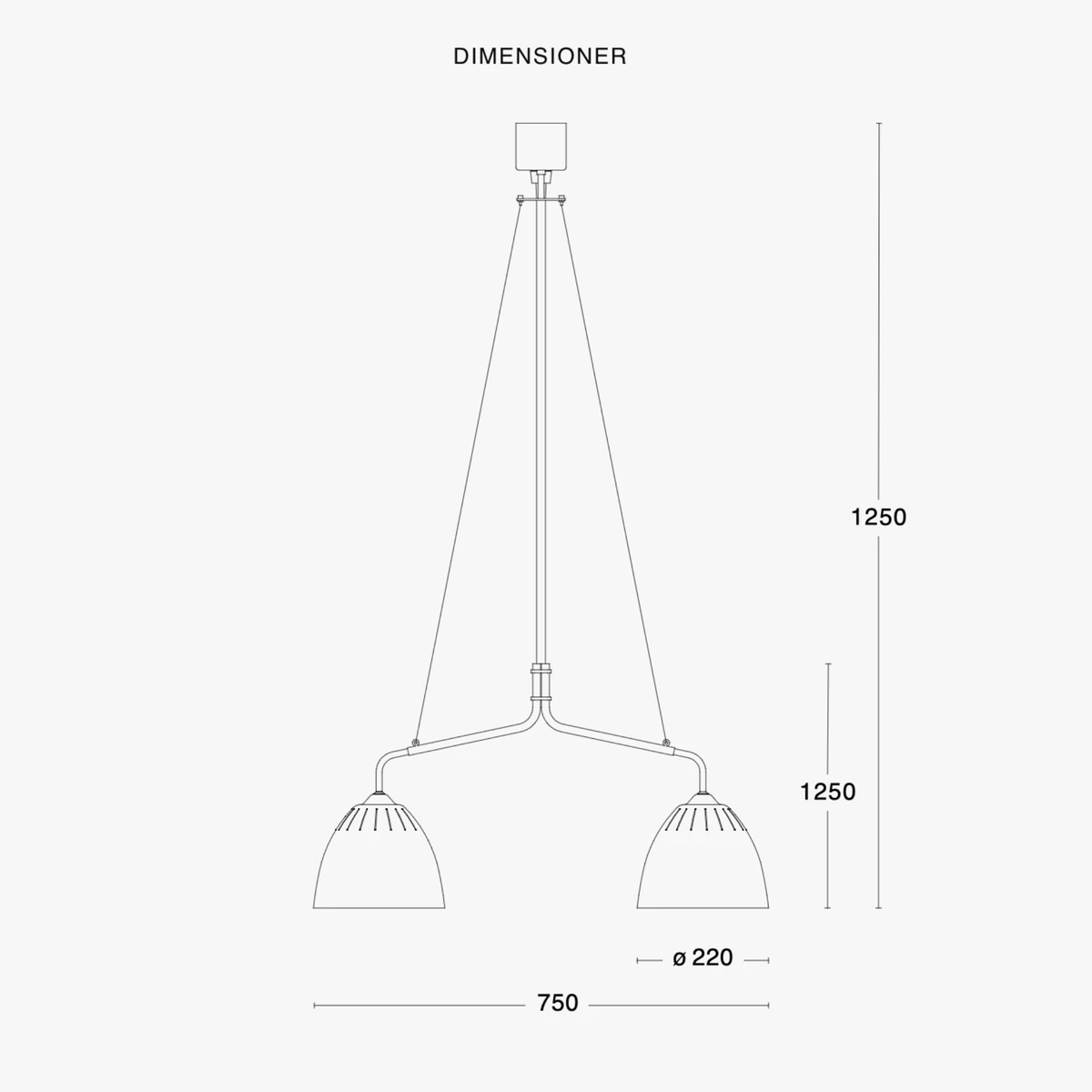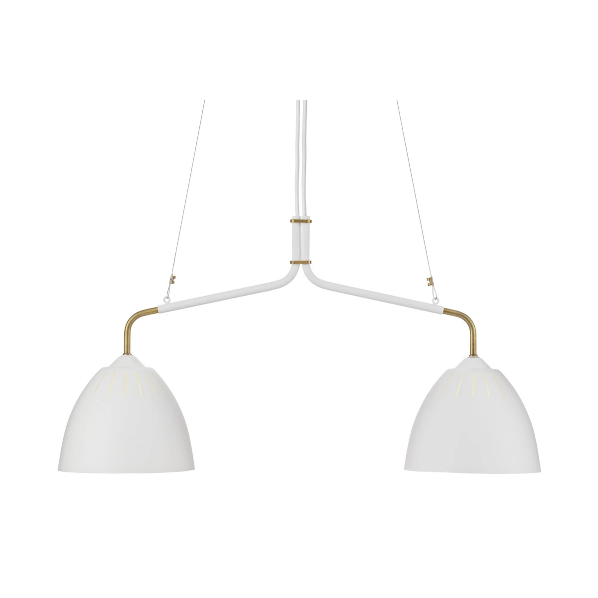 Lean er tilgjengelig i matt svart og hvit teksturfarge. Taklampen med to lyskilder, sprer lyset fint over spisebordet og tilfører en fin formdetalj til rommet. Små solide brett i rå messing følger med i wireopphenget og blir en flott ekstra detalj.