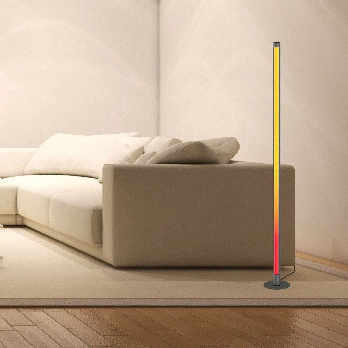 Gulvlampe med mulighet for å endre fargen på lyset, justere lysstyrken, blinke i takt med musikk og flere funksjoner.