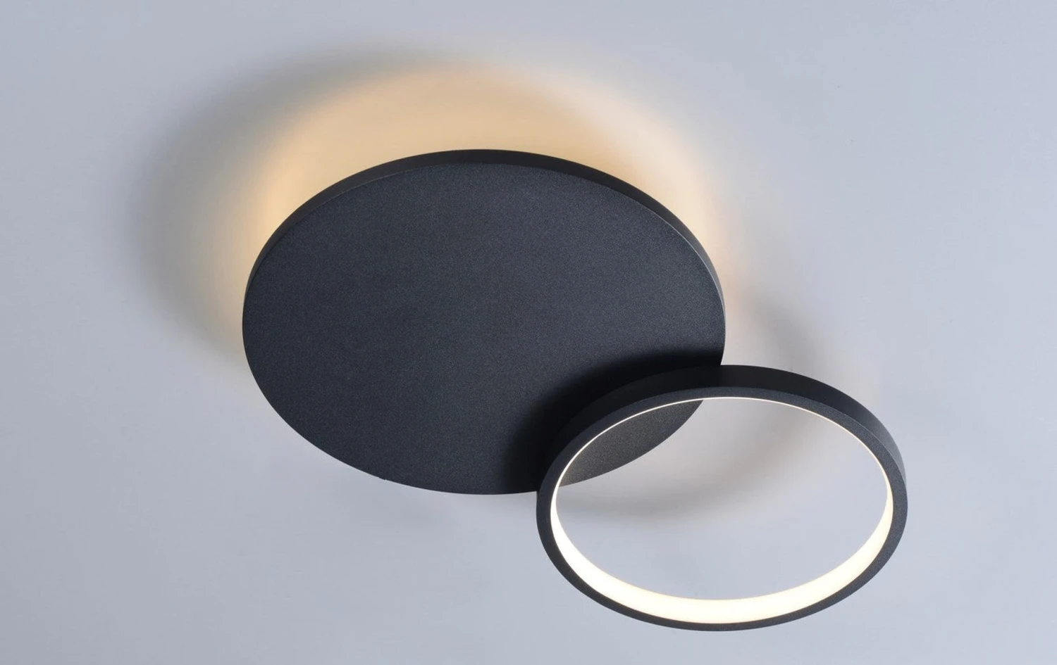 Den sorte bakplaten har lyskilden på baksiden og skaper et indirekte og dekorativt lysbilde. Den åpne ringen har lyskilden på innsiden.