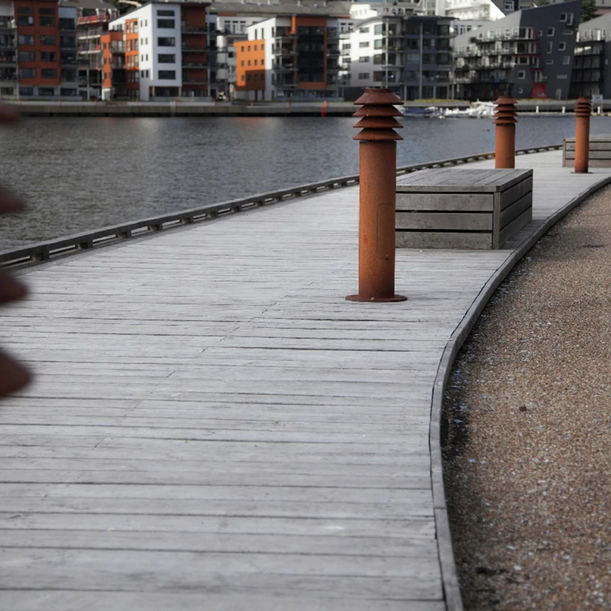 - Materiale: Armaturhode: Presstøpt jern. Mast: Corten stål. Sokkelplate: Corten stål.
