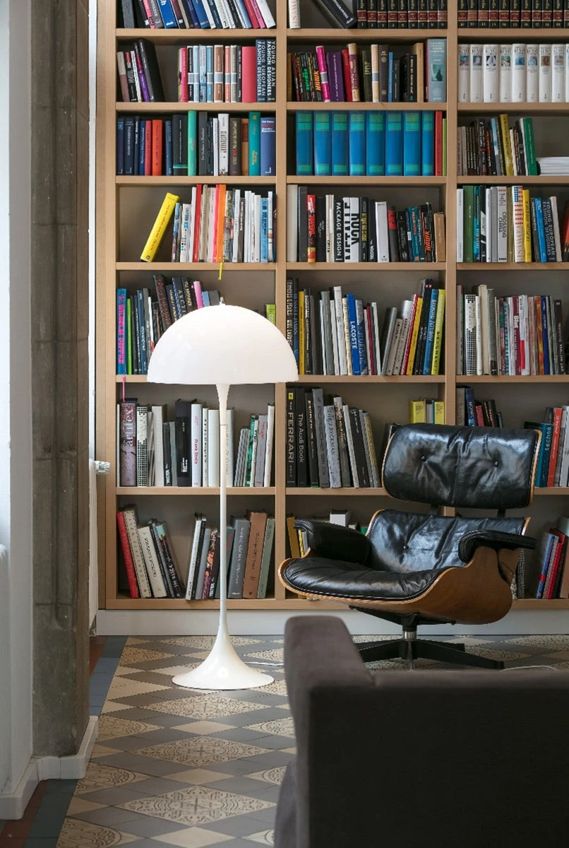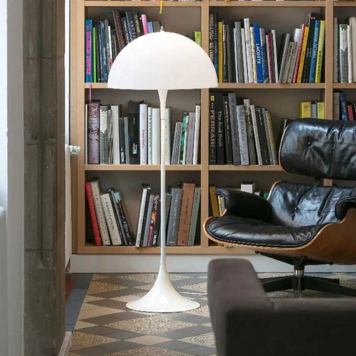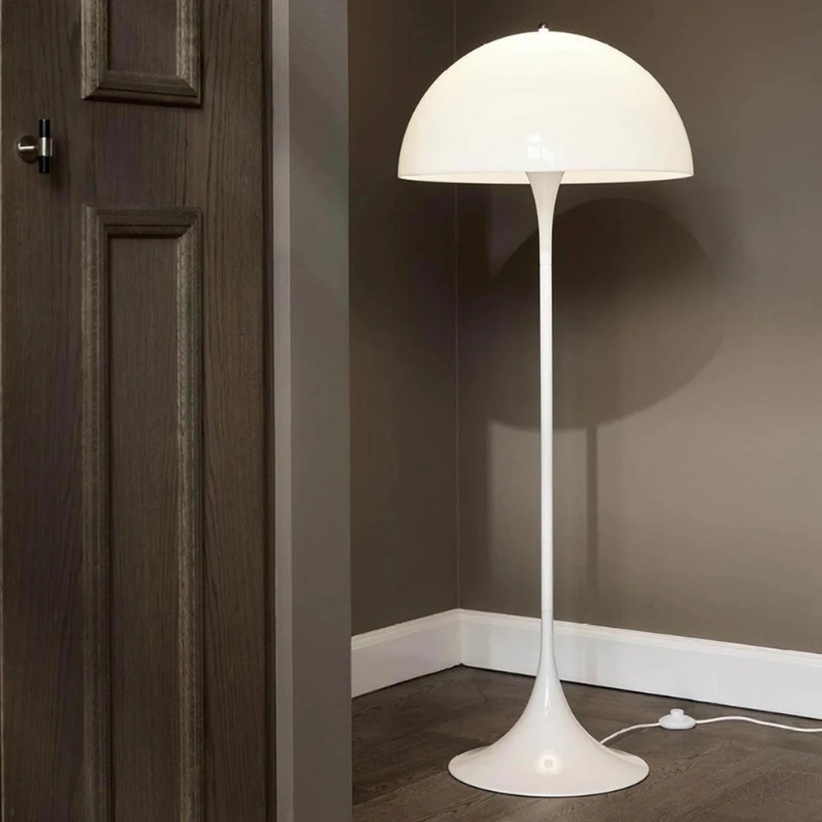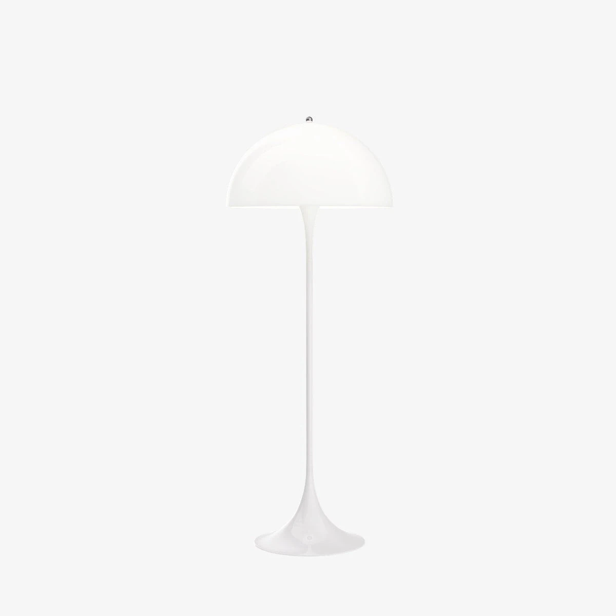 Med sitt blendefrie lys er Panthella gulvlampen et vakkert eksempel på Verner Pantons strålende sans for å skape stemningsfull belysning. Lampen gir alltid et høyt komfortnivå med mykt, diffust lys. Skjermen i opal/akryl etterlater en diffus, behagelig lysatmosfære på grunn av den gjennomskinnelige skjermen, den nedadgående refleksjonen fra den indre skjermen og refleksjonen fra trompetstammen.