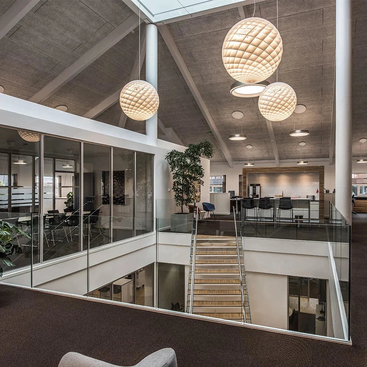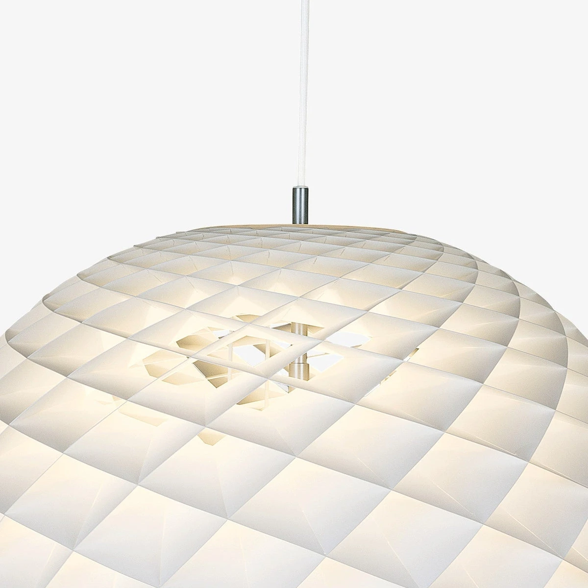 Den sfæriske pendelen avgir en blendefri lysglød som reflekteres av de små diamantformede cellene som armaturen er laget av. Strukturen på lampen sikrer at lyset er blendefritt fra over 45 graders vinkel, samtidig som armaturen avgir et nedadrettet lys og oppadrettet glød som lyset opp taket for å gi omgivelsene en god stemning. Hver celle former lyset ved å skape myke overganger mellom direkte og reflektert lys for å understreke pendelens strålende sfære.