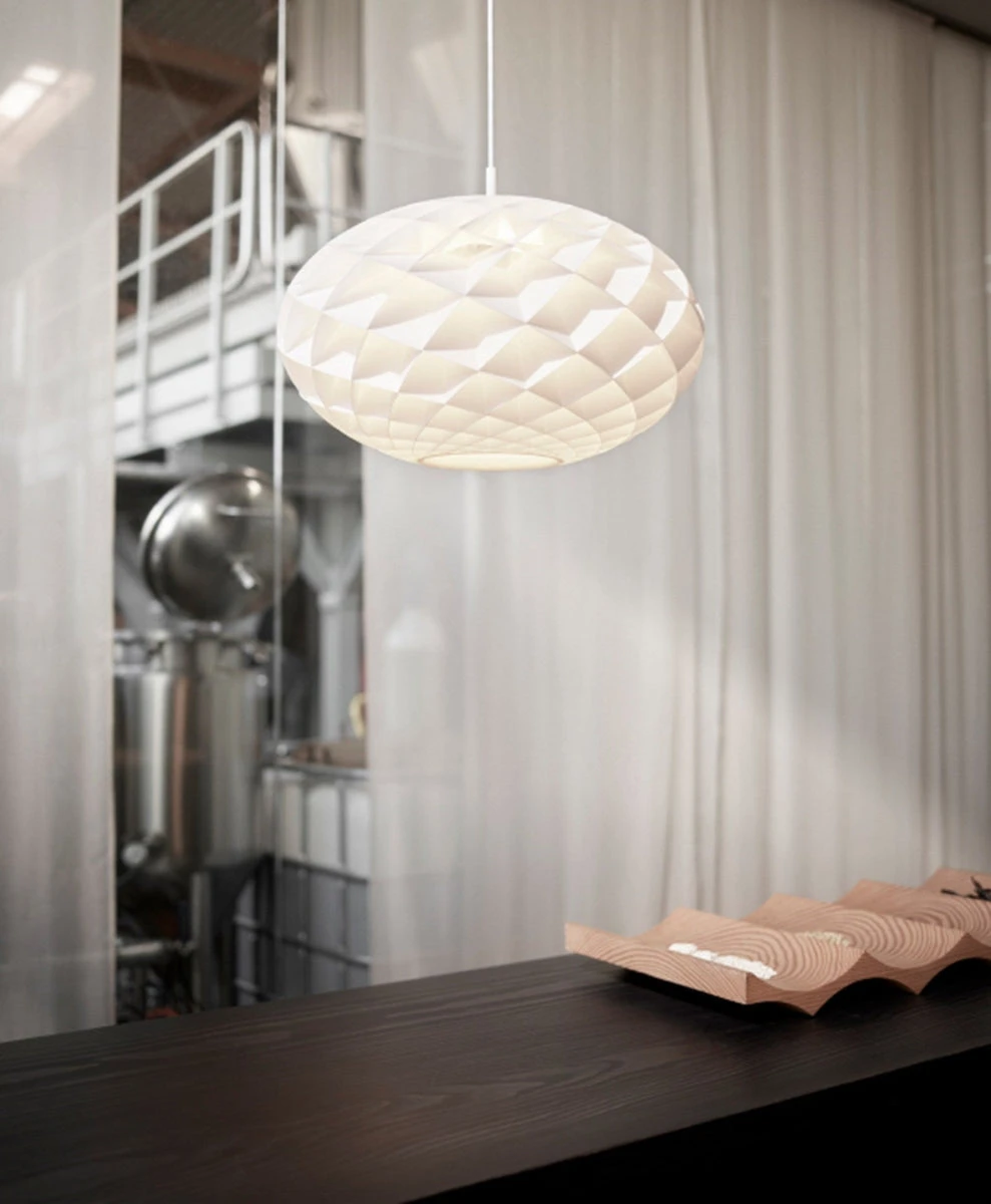 Patera Oval er en del av Patera-pendelserien, som ble designet av Øivind Slaatto og lansert i samarbeid med Louis Poulsen i 2015. Patera-pendelen er en moderne utgave av den klassiske lysekronen. Den har et glødende sentrum og gir en myk, dynamisk belysning til moderne rom. Pateras blendefrie 360 graders lys er resultatet av en intrikat design med ulikt posisjonerte celler som utstråler et naturlig, jevnt og innbydende lys til omkringliggende rom, mennesker og gjenstander. Formen er vakker å se på fra alle vinkler, og den Fibonacci-sekvensbaserte strukturen gir et nytt inntrykk fra hver vinkel en betrakter den fra. «Det endelige målet mitt var å skape en tredimensjonal Sudoku. Det var en ekstremt matematisk oppgave. Faktisk er det det mest komplekse lyset jeg noensinne har skapt … Jeg syns det er poetisk, og jeg ville konstruere en moderne krystallysekrone. Jeg håper den vil inspirere folk til å bevege seg rundt den. Jeg håper den skaper liv.» (Øivind Slaatto) Med Patera Oval hadde Øivind Slaatto og Louis Poulsen som mål å skape en pendel med en lett, minimalistisk form som gir en tidløs, men moderne og funksjonell armatur som kan brukes i rom med lave tak. Patera Oval er basert på de samme prinsippene og fengslende mønsteret flettet for hånd som den klassiske Patera – men det utgjør ikke en sfære, men en flat sirkulær form som ser ut som en oval fra siden, inspirert av ellipsoidens organiske former. Patera Oval har en rund åpning for å optimalisere det direkte lyset mot den underliggende overflaten med en myk overgang mot det reflekterte lyset. Med sin flate, minimalistiske design passer Patera Oval til rom med begrenset takhøyde eller hvor takhøyde er nødvendig. Pendelen er også perfekt som et høyt hengende pendel eller over et spisebord for å skape en romslig følelse mellom bordet og taket.