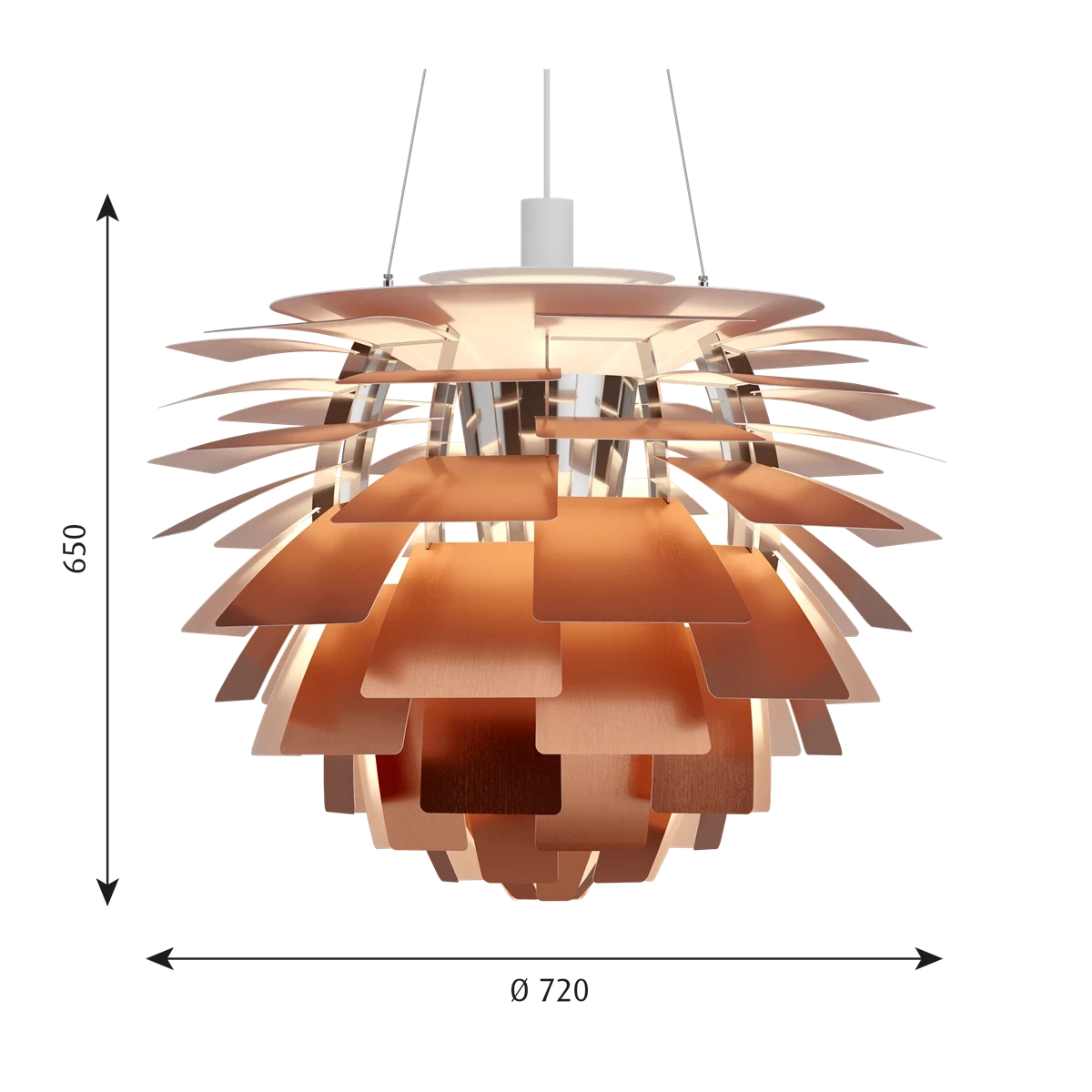 I 1958 designet Poul Henningsen PH Artichoke for Langelinie Pavilion, en modernistisk restaurant i København. Der fortsetter PH Artichoke å fortrylle gjestene den dag i dag og pendelen anses som et internasjonalt designikon. Den markante formen og designen på pendelen sikrer et helt blendefritt lys, uansett hvilken vinkel den ses fra. Dette skyldes de 72 nøye plasserte bladene, som også har inspirert navnet til pendelen. PH Artichoke blir fortsatt delvis satt sammen for hånd for å sikre høy kvalitet. Og ja, det er sant at den tar opp mye plass. Kvaliteten på lyset og elegansen er imidlertid uten sidestykke. Den berømte armaturen er fortsatt tilgjengelig i sin opprinnelige kobberutførelse. Over tid har versjoner i børstet og polert stål, messing og hvitt metall blitt lagt til, og disse fortsetter å understreke pendelens allsidighet og tidløse silhuett. PH Artichoke i svart innføres i 2020. Med en perfekt matt svart finish skaper denne versjonen et dristig utseende for et mer særskilt preg uten at det går på bekostning av verken design eller lyskvalitet.