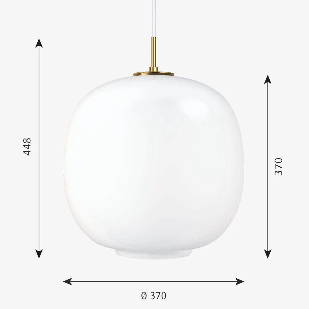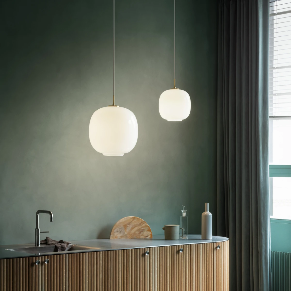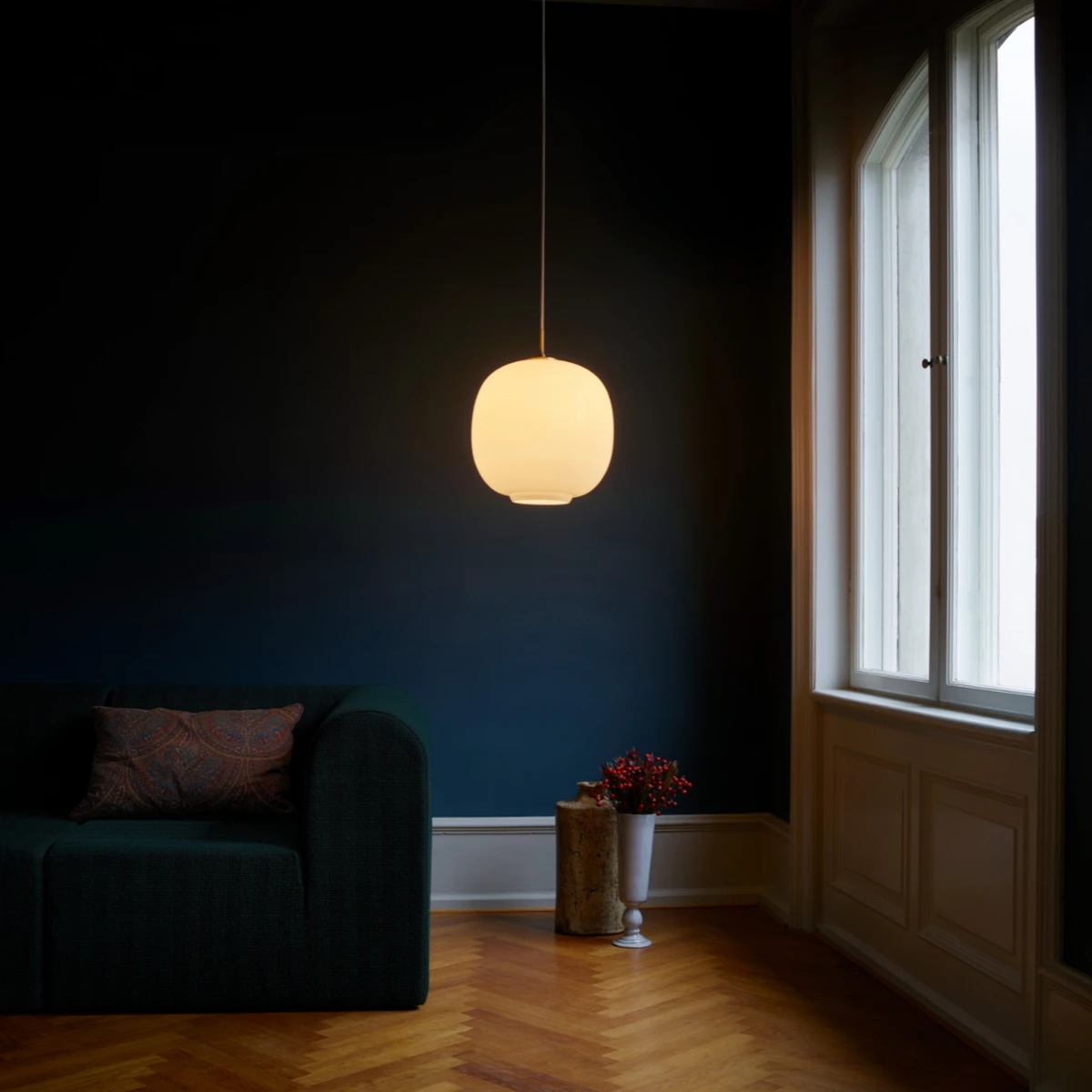 - Materiale: Skjerm: Munnblåst, polert, hvitt opalt glass. Pendelfeste: Ubehandlet børstet messing, vil patinere.