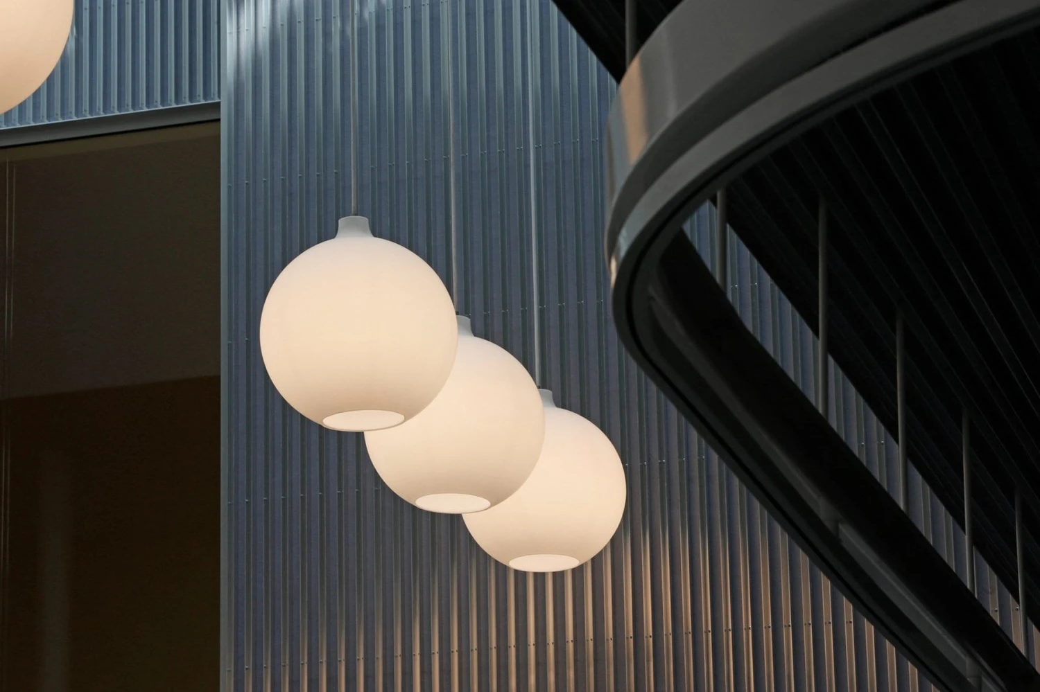 - Materiale: Munnblåst, matt hvitt opalt glass. Pendelrør: Børstet stål.