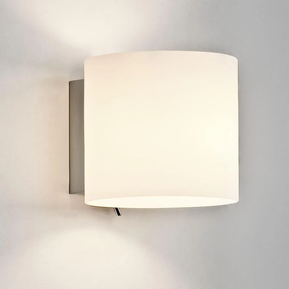 Luga er en nydelig vegglampe med hvit glasskuppel som lyser opp og ned.