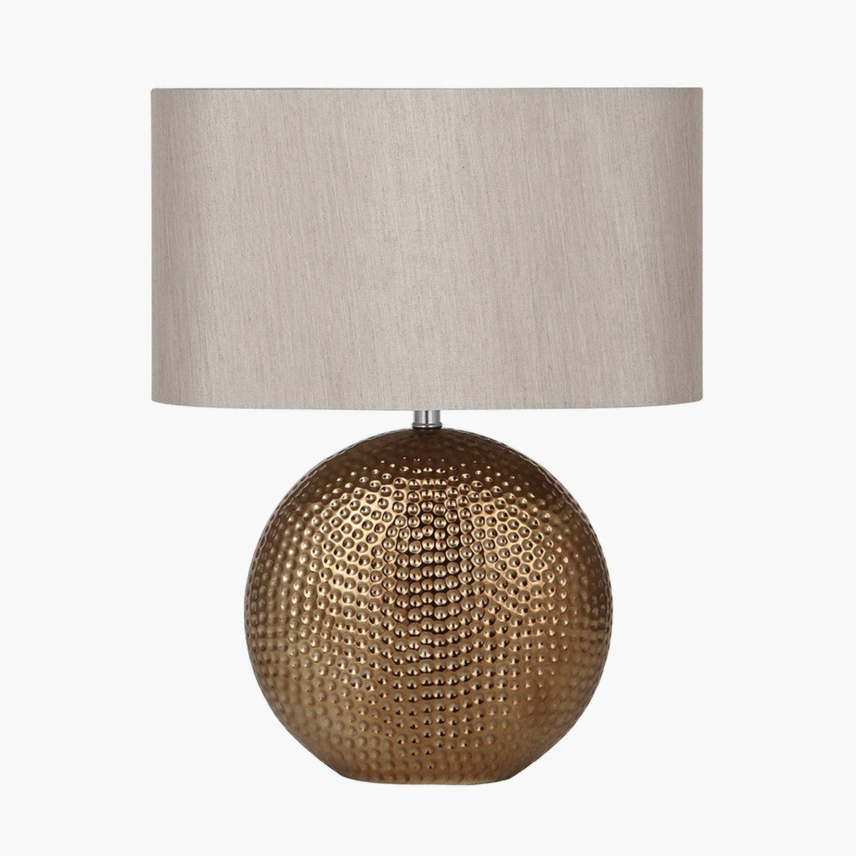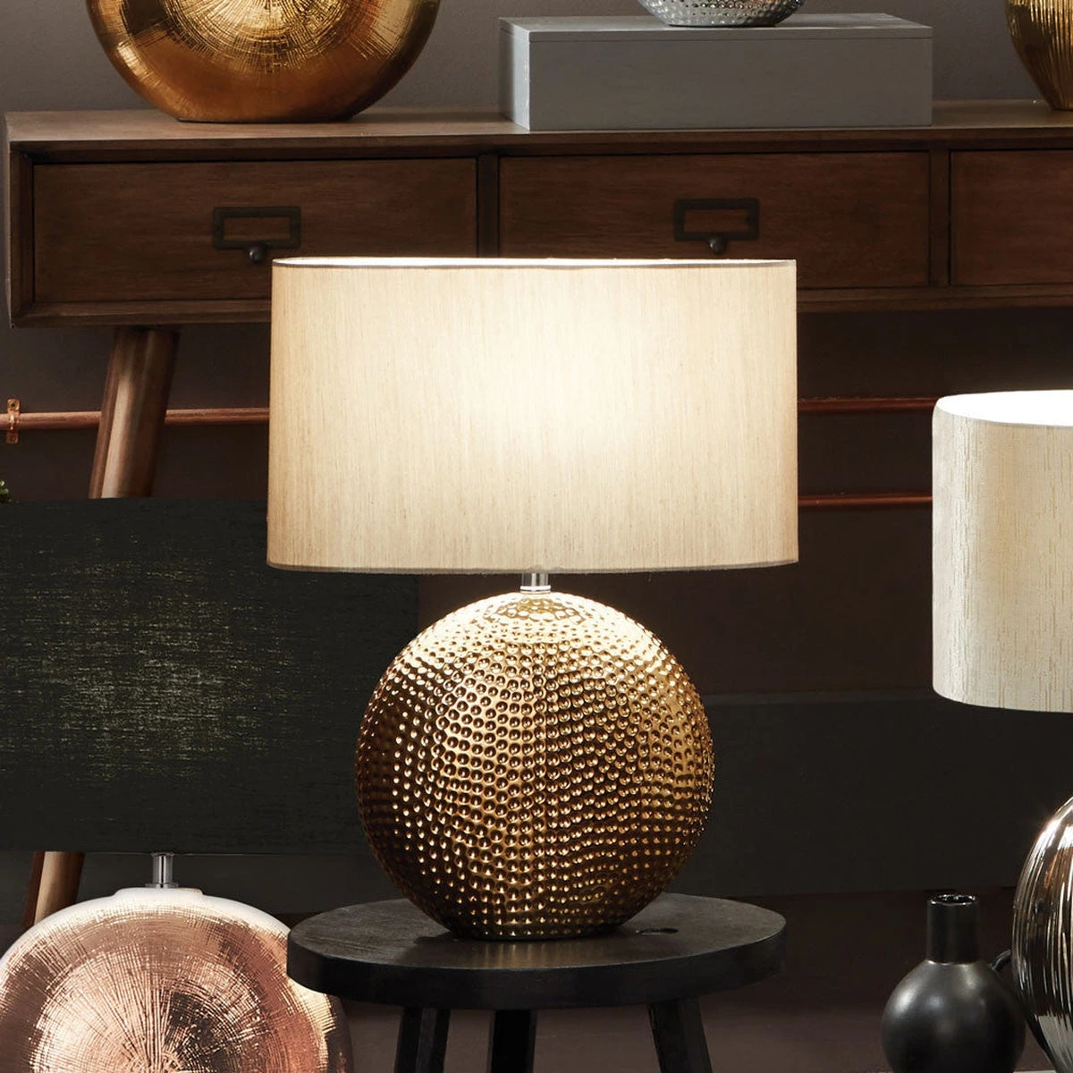 Bordlampe i lakkert kjeramikk. Lampen leveres komplett inklusive skjerm. Rund skjerm i lys beige silke.