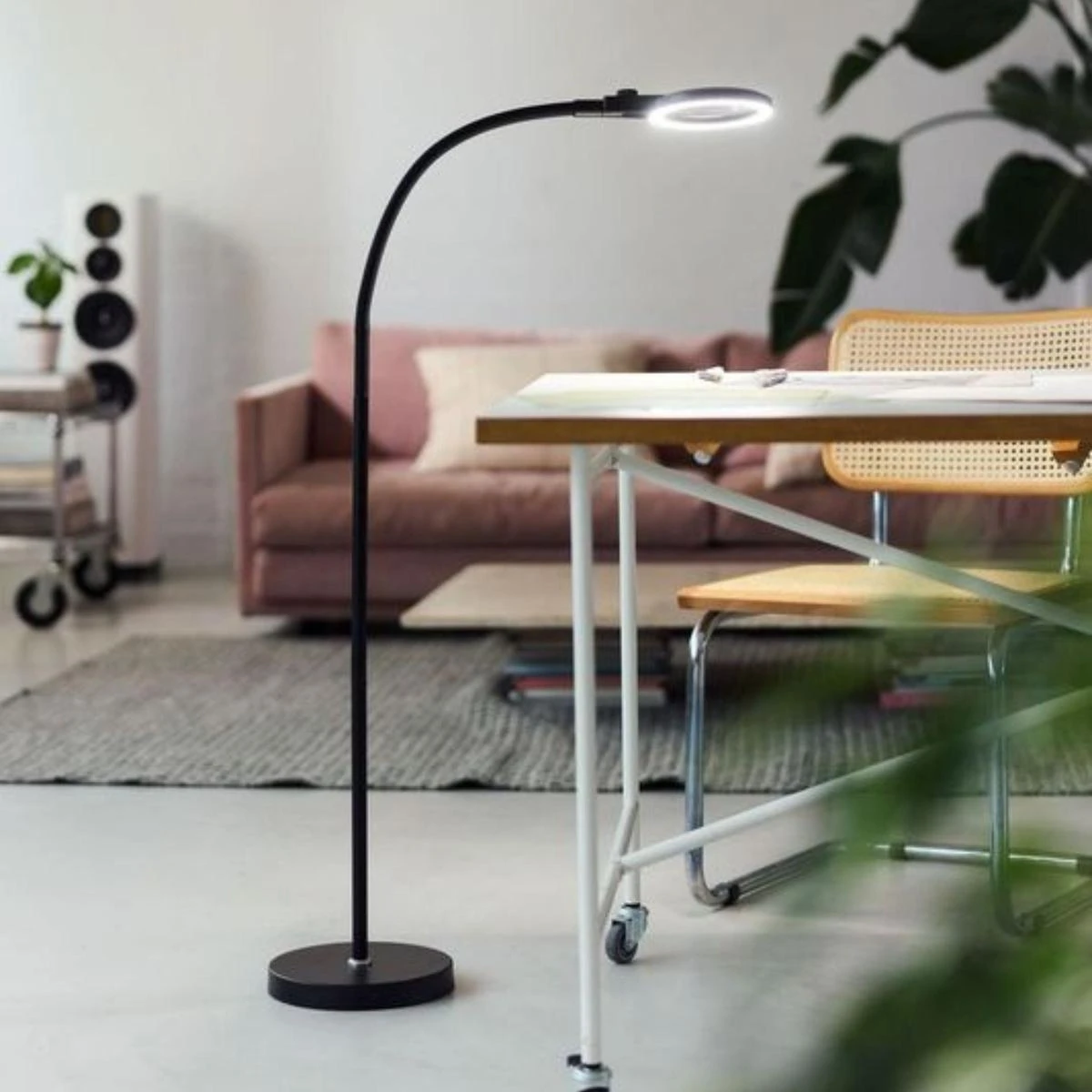 Magni – oppladbar gulvlampe med mye lys og funksjonalitet. Lampen har forstørrelses glass 3 ganger forstørring.