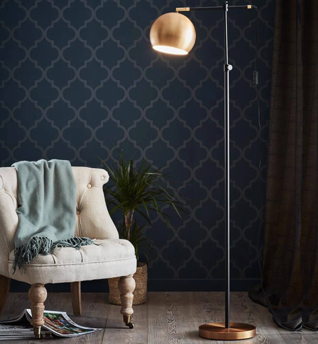 Chester gulvlampe fra Marksløjd. Lampen er laget av metall, i fargen sort og bronse.