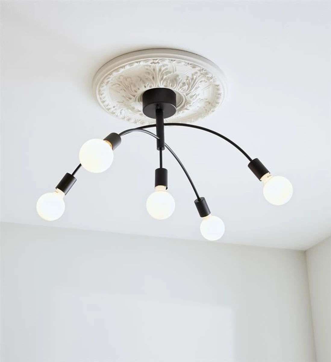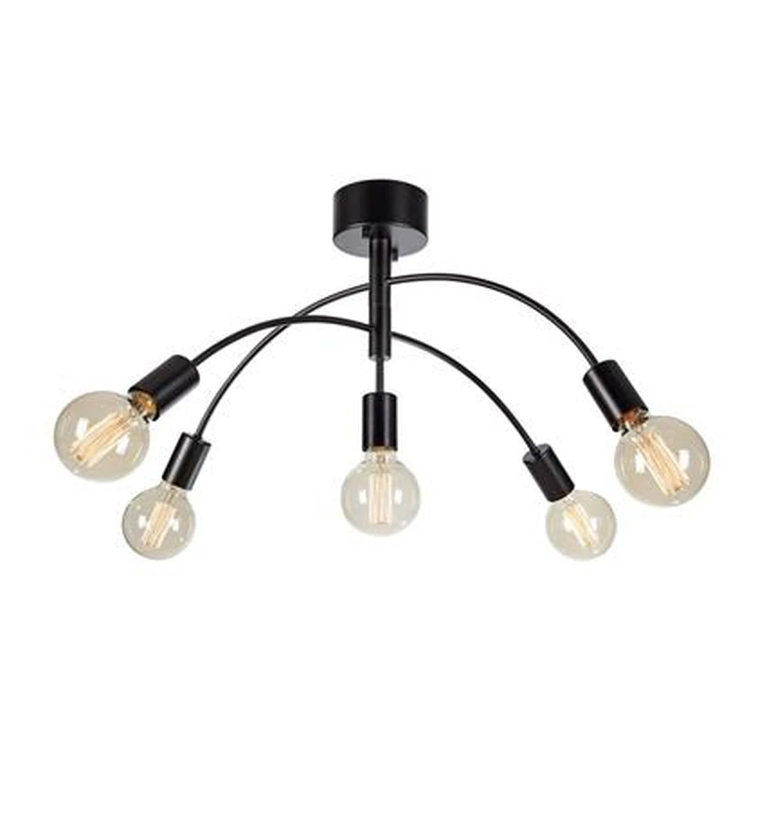Lekker taklampe i svart metall. 5 stk lyspærerer med E27-sokkel kjøpes separat, bruk gjerne dekorlyspærer i LED for å få et stilig uttrykk.