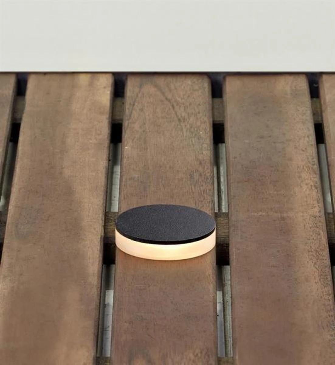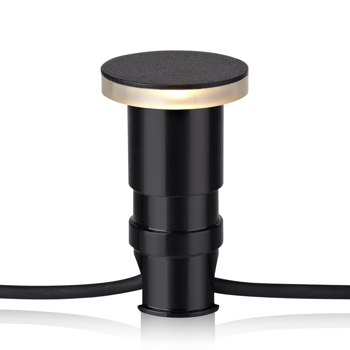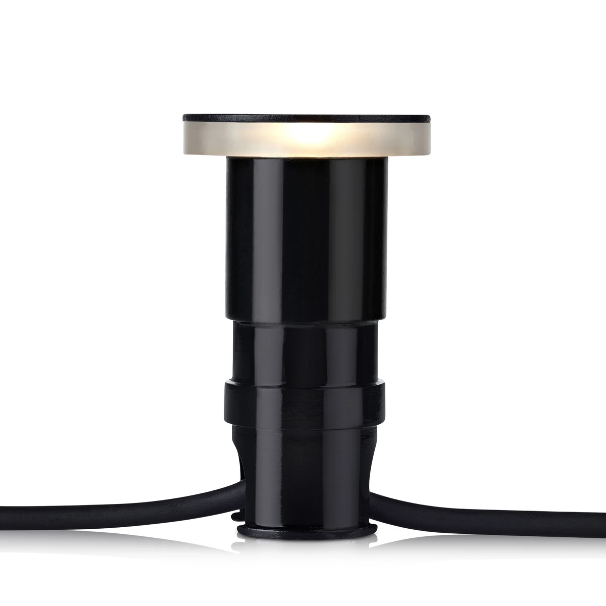 Garden 24-decklight fra Markslöjd. Lyser 360 ° rundt sidelengs. 3W fast lyskilde. Pulverlakkert aluminium med akryldetaljer. IP44 for utendørs bruk. Transformer kjøpt separat.