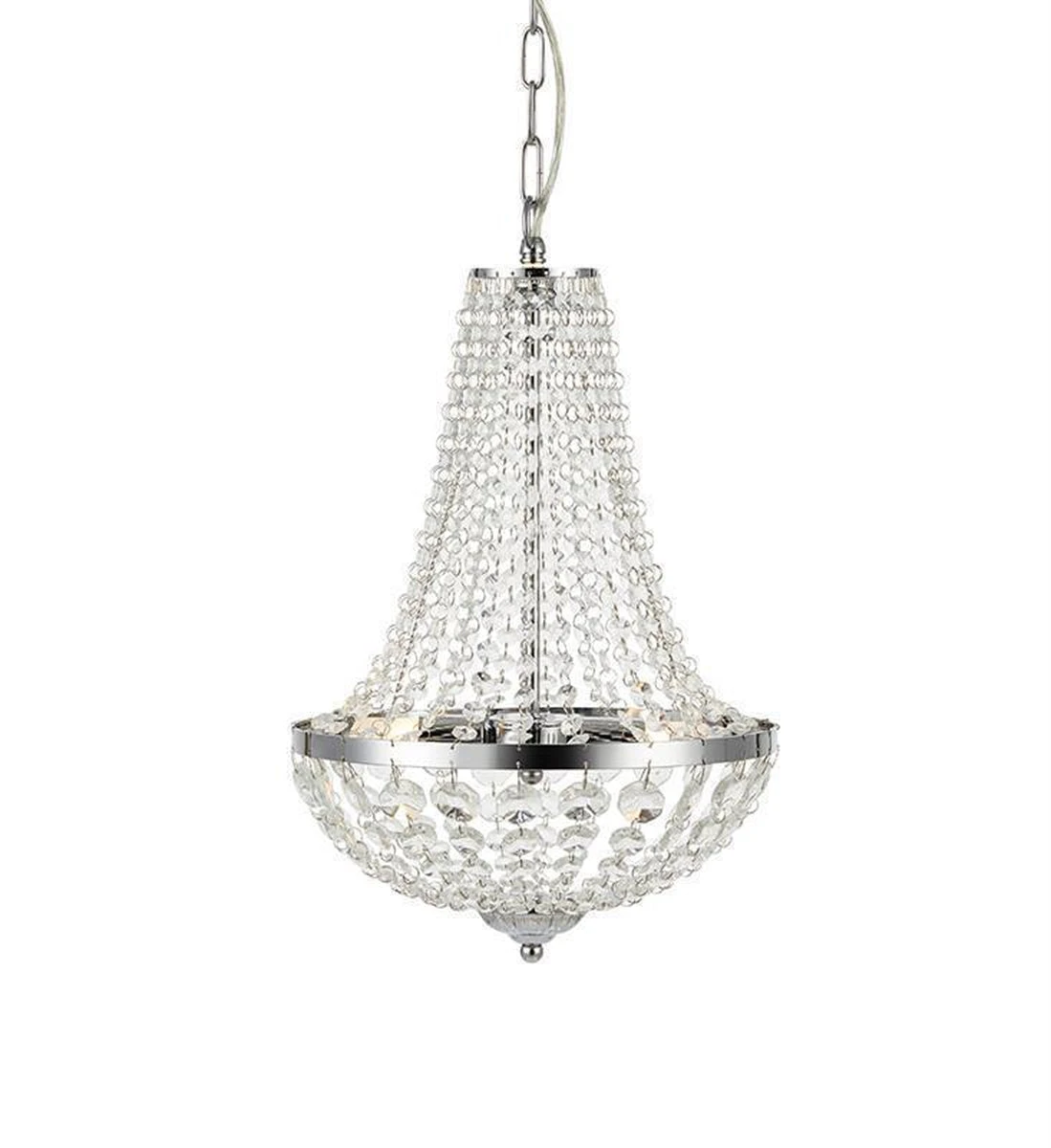 Krystallkrone i krom metall med glassprismer. Du behøver 2 stk lyspærer med G9-sokkel til lampen.