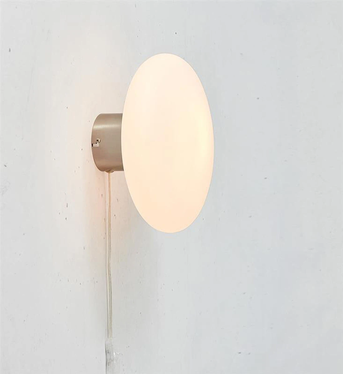 Locus 2 i 1 lampe fra Markslöjd. Kan monteres i enten tak eller vegg. Sokkel i stål og skjerm i ovalt hvitt glass 2m gjennomsiktig PVC-kabel med bryter på ledning og støpsel. Koblingsboks i platen for enkelt å kunne montere på direkte innkommende strøm.