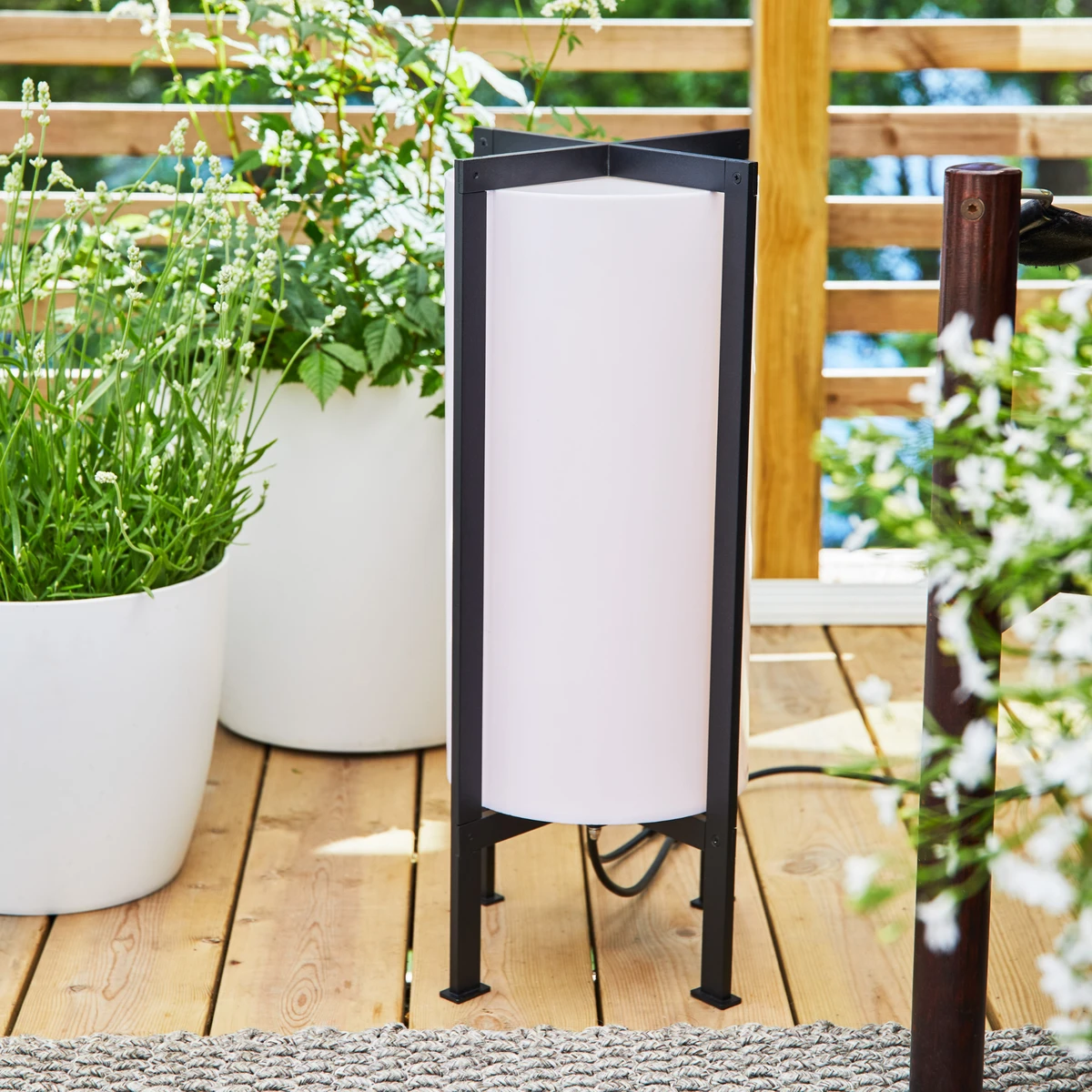 Garden 24 pullerter fra Markslöjd. 54 cm høy sylindret pullert med hvit skjerm og ramme i svart metall. Godkjent for utendørs bruk. IP44. Designet av Monika Mulder. 6W solid LED. Transformator selges separat.